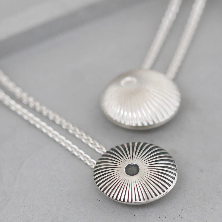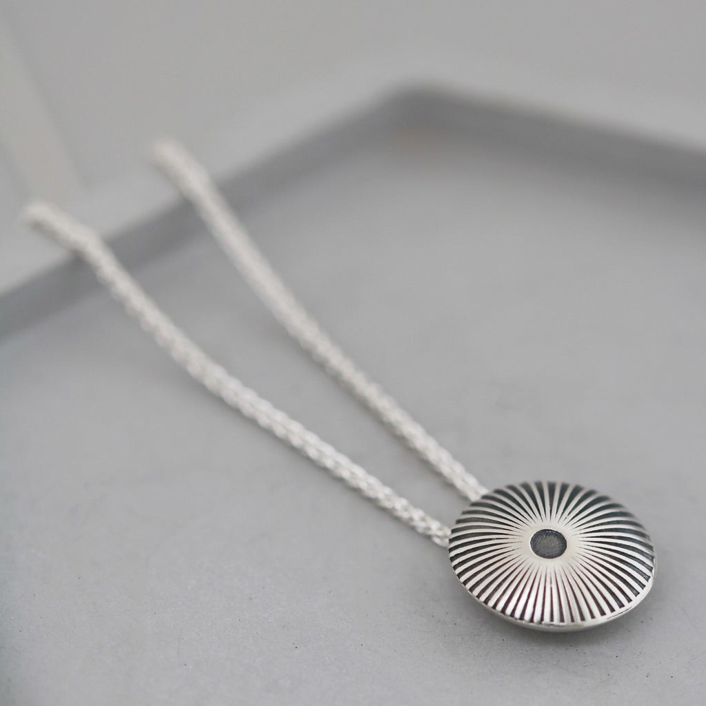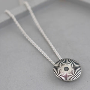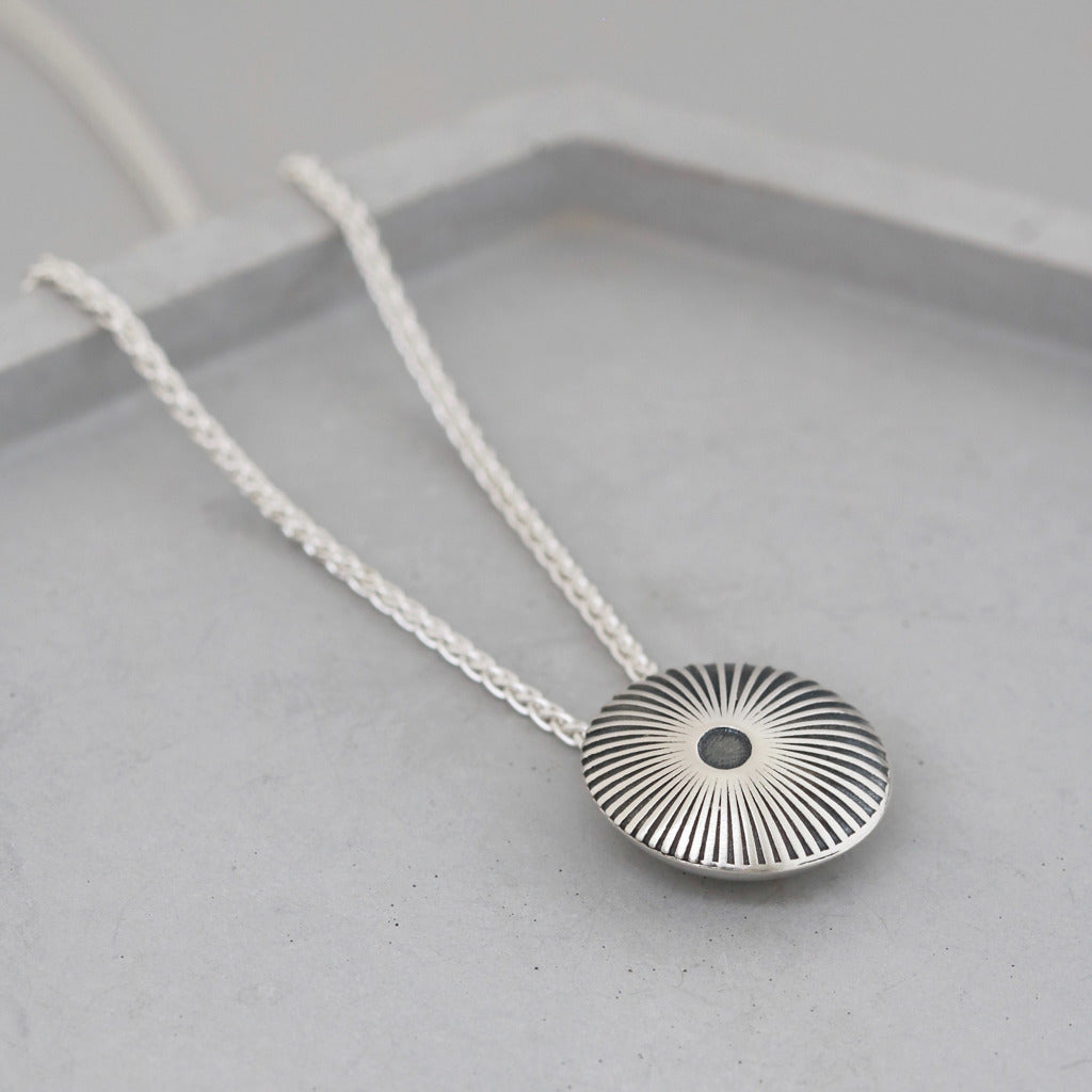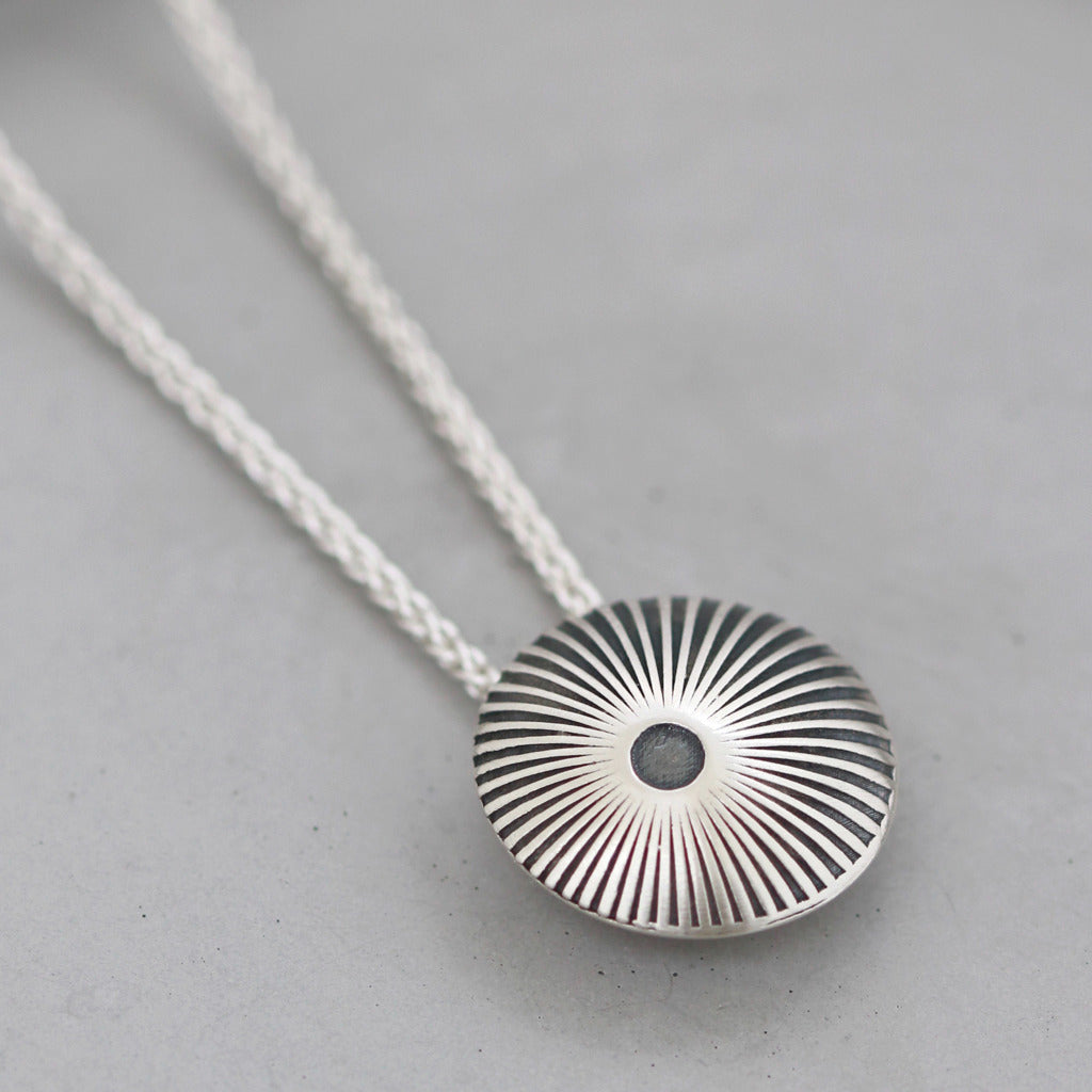 This solid sterling silver necklace has an art deco inspired sunburst motif on a domed circle. It is completed with a domed back to create a really comfortable slider necklace that has crisp, well defined detailing that really draws the eye. The pendant is set on a delicate silver chain that doesn’t take focus away from the centrepiece. The well-defined lines of the motif emanate out from an off centre position to create a pattern that reminds me of a burst of light. The pattern is a little more subtle on the all silver design, the black and silver version has a little more drama and creates a great contrast highlighting the design. I’m so pleased with the end result, the well defined lines.