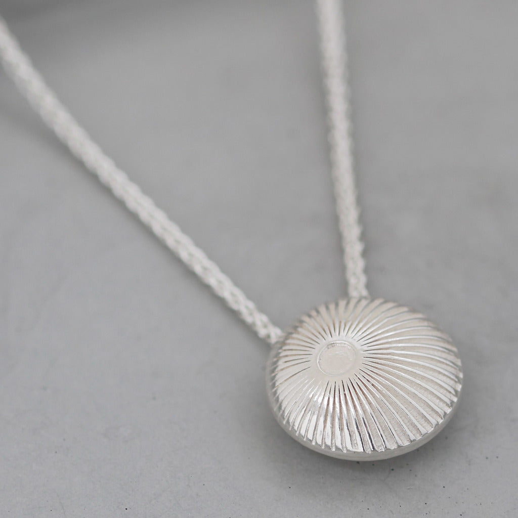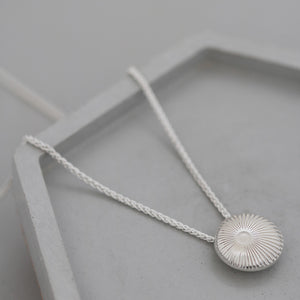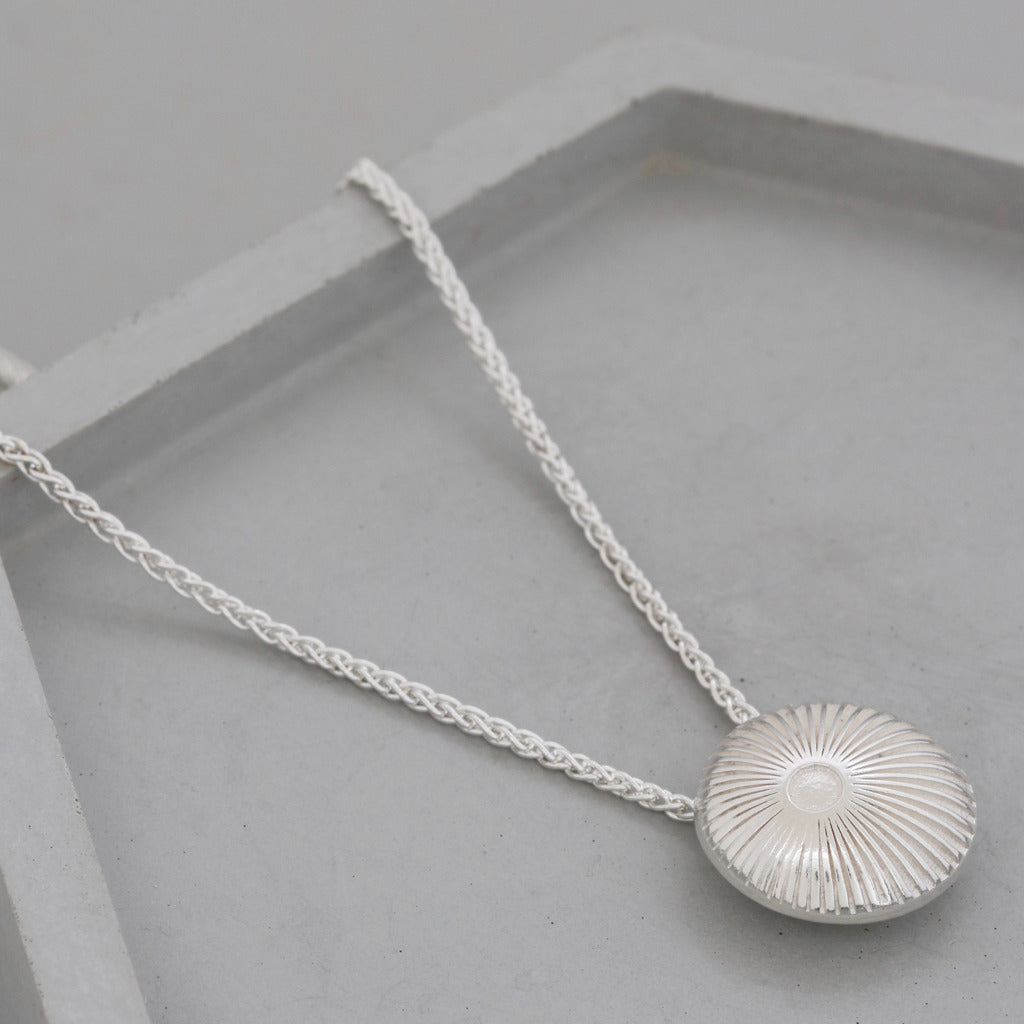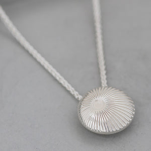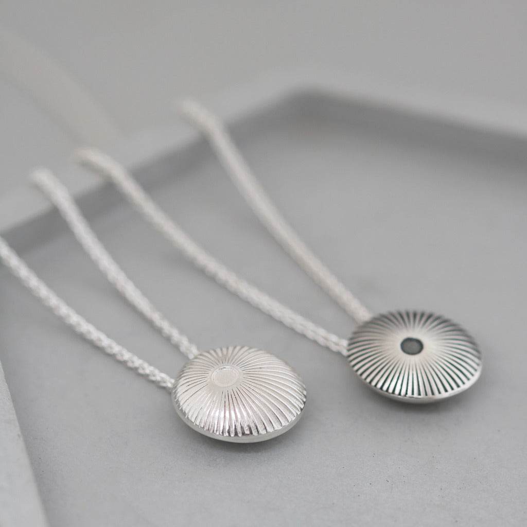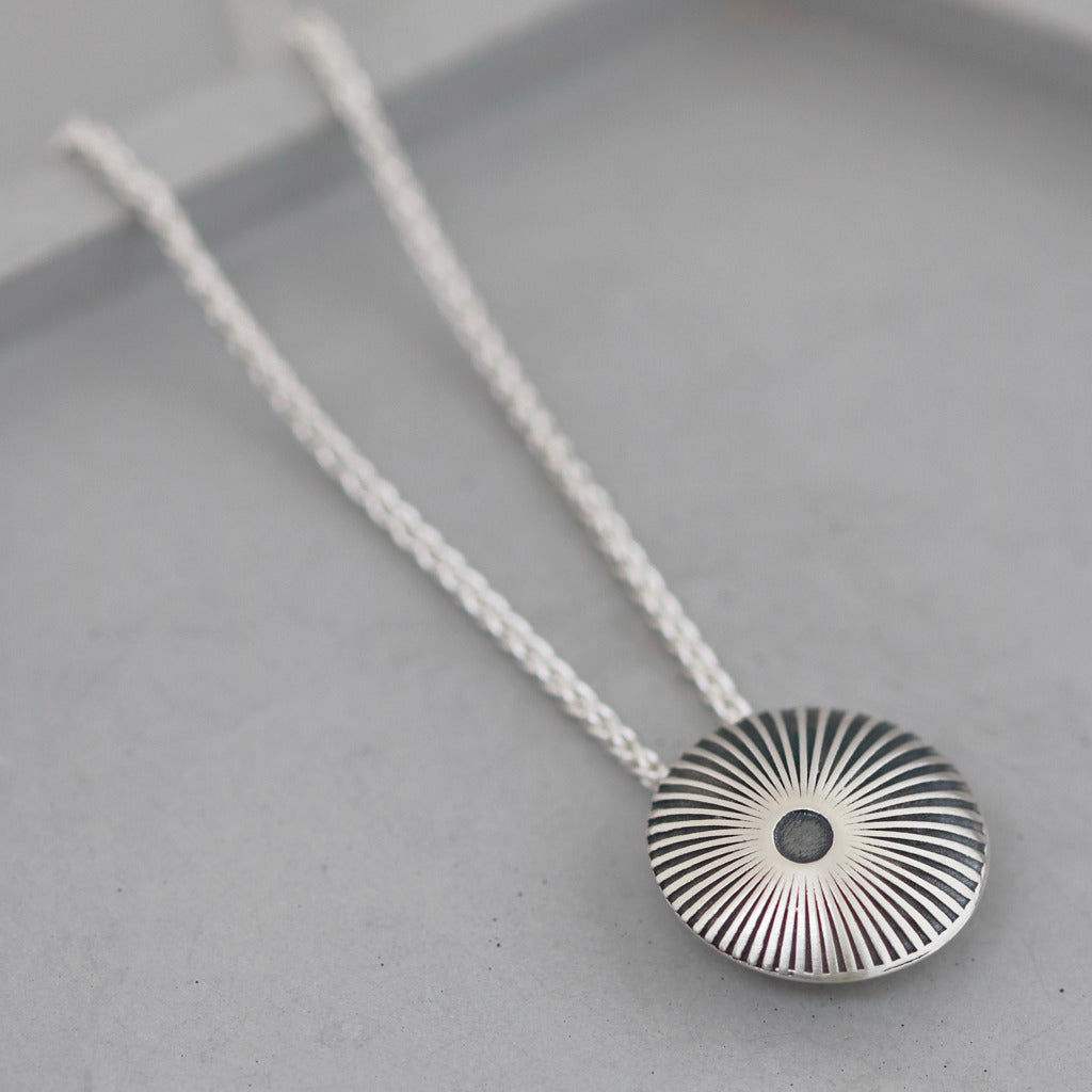 This solid sterling silver necklace has an art deco inspired sunburst motif on a domed circle. It is completed with a domed back to create a really comfortable slider necklace that has crisp, well defined detailing that really draws the eye. The pendant is set on a delicate silver chain that doesn’t take focus away from the centrepiece. The well-defined lines of the motif emanate out from an off centre position to create a pattern that reminds me of a burst of light. The pattern is a little more subtle on the all silver design, the black and silver version has a little more drama and creates a great contrast highlighting the design. I’m so pleased with the end result, the well defined lines.