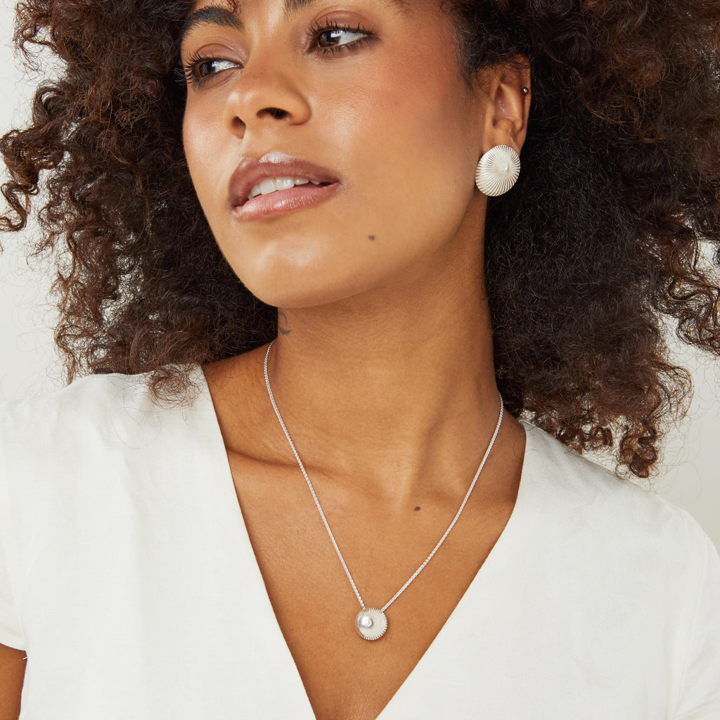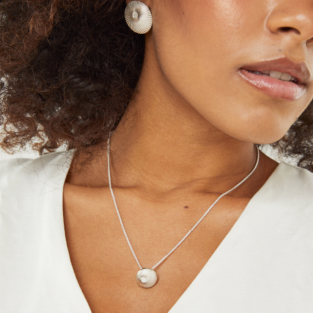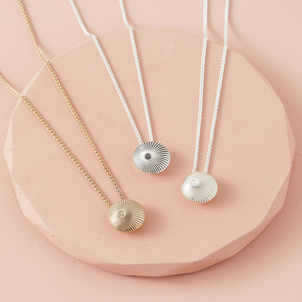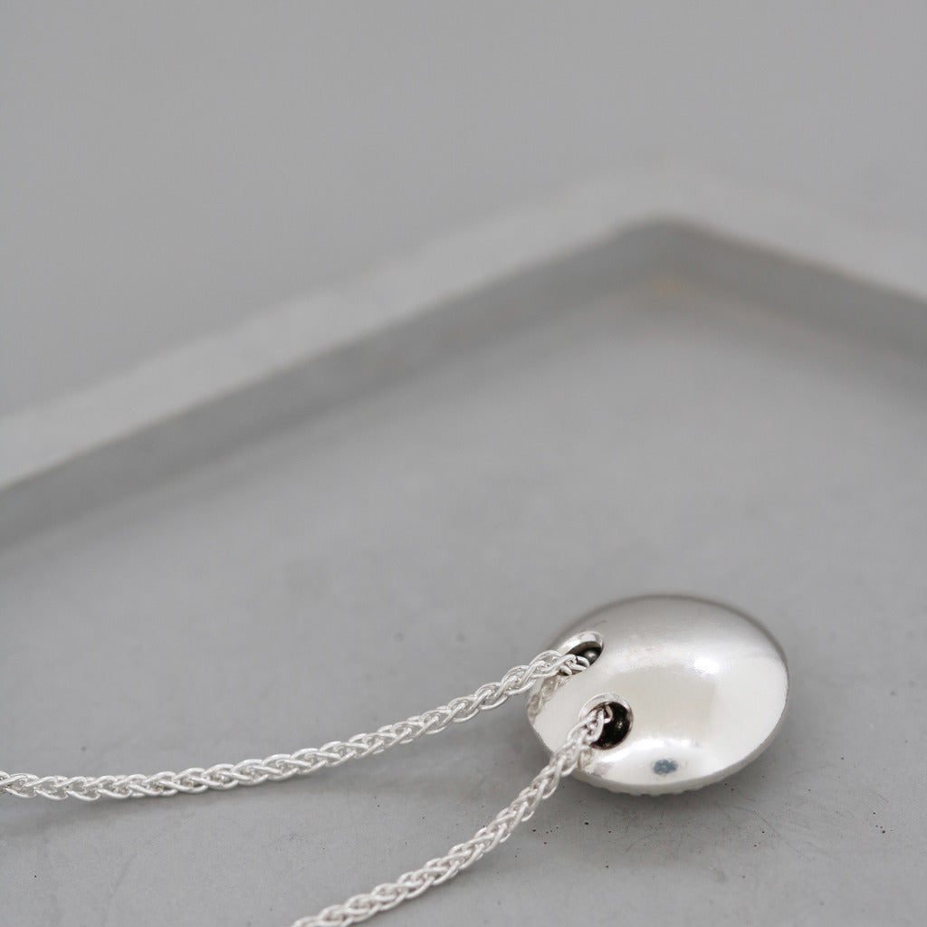 This solid sterling silver necklace has an art deco inspired sunburst motif on a domed circle. It is completed with a domed back to create a really comfortable slider necklace that has crisp, well defined detailing that really draws the eye. The pendant is set on a delicate silver chain that doesn’t take focus away from the centrepiece. The well-defined lines of the motif emanate out from an off centre position to create a pattern that reminds me of a burst of light. The pattern is a little more subtle on the all silver design, the black and silver version has a little more drama and creates a great contrast highlighting the design. I’m so pleased with the end result, the well defined lines.