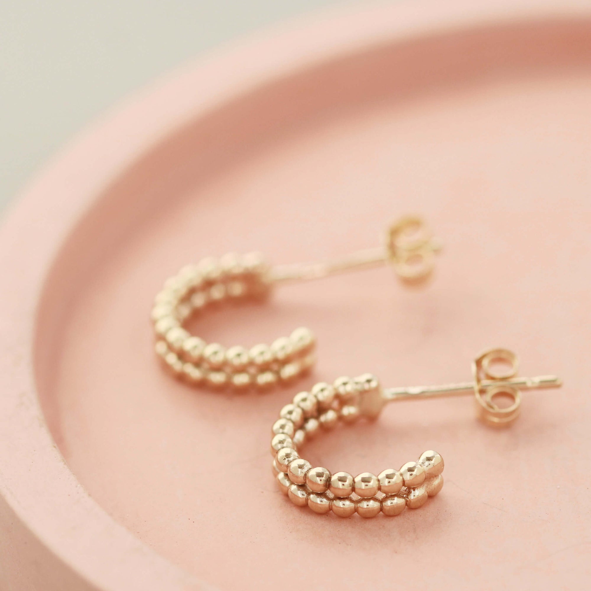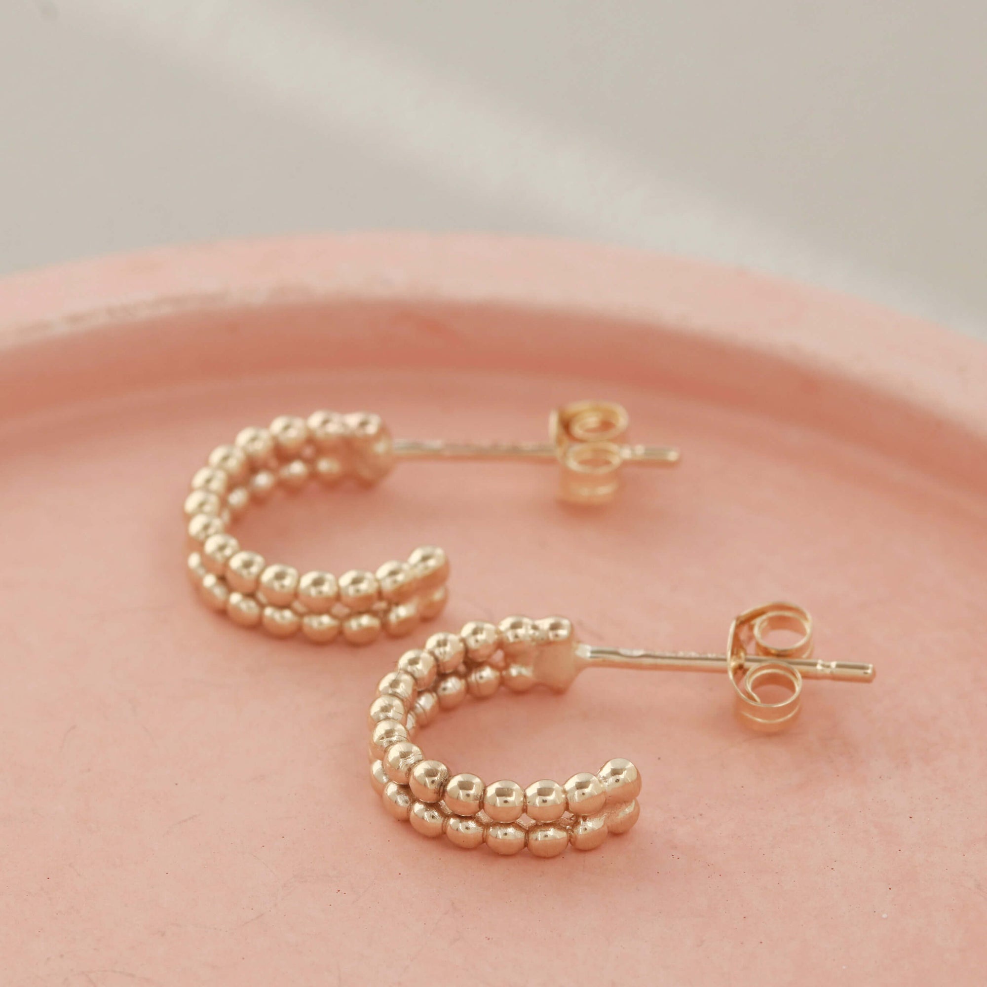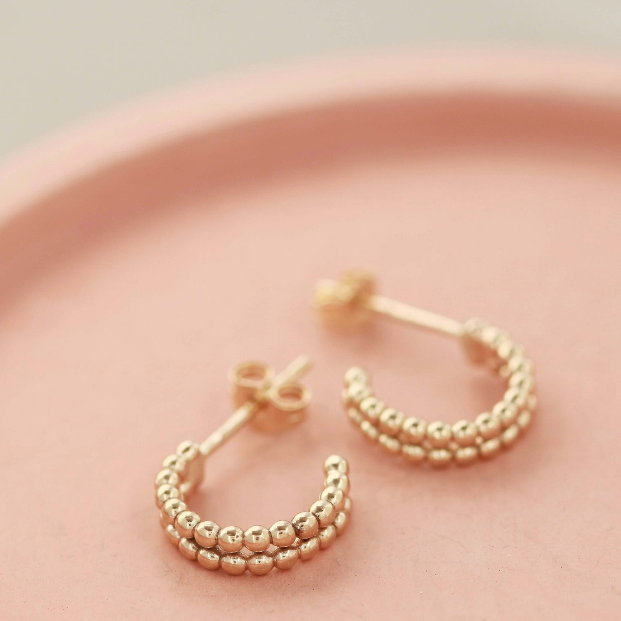 Small 9ct gold hoop earrings with a beautifully subtle double-hoop beaded design, these are the perfect everyday huggies for anyone who loves minimalist style. Handcrafted in real 9 carat gold, the sculpted beaded texture gives these hoops a refined sparkle while keeping the look understated and effortless. Ideal for work, gifting, or wearing in second piercings, these tiny hoops add a soft touch of luxury to any jewellery collection.