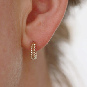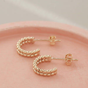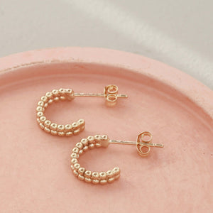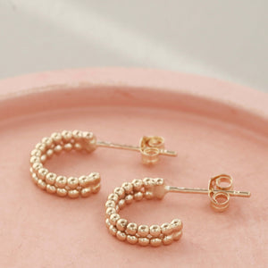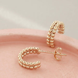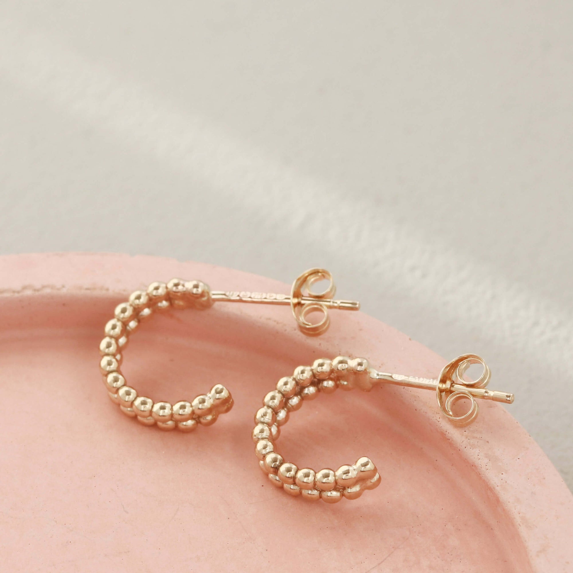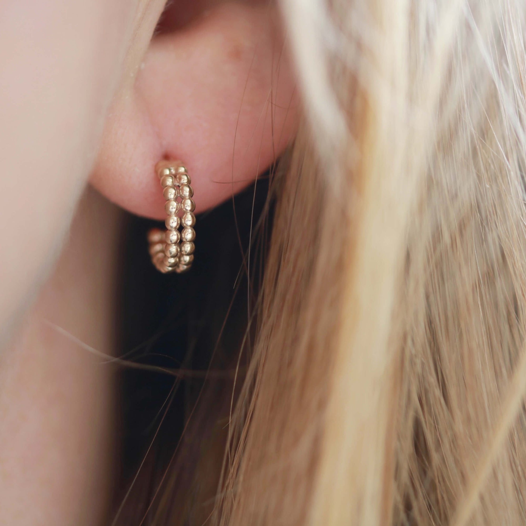 Small 9ct gold hoop earrings with a beautifully subtle double-hoop beaded design, these are the perfect everyday huggies for anyone who loves minimalist style. Handcrafted in real 9 carat gold, the sculpted beaded texture gives these hoops a refined sparkle while keeping the look understated and effortless. Ideal for work, gifting, or wearing in second piercings, these tiny hoops add a soft touch of luxury to any jewellery collection.