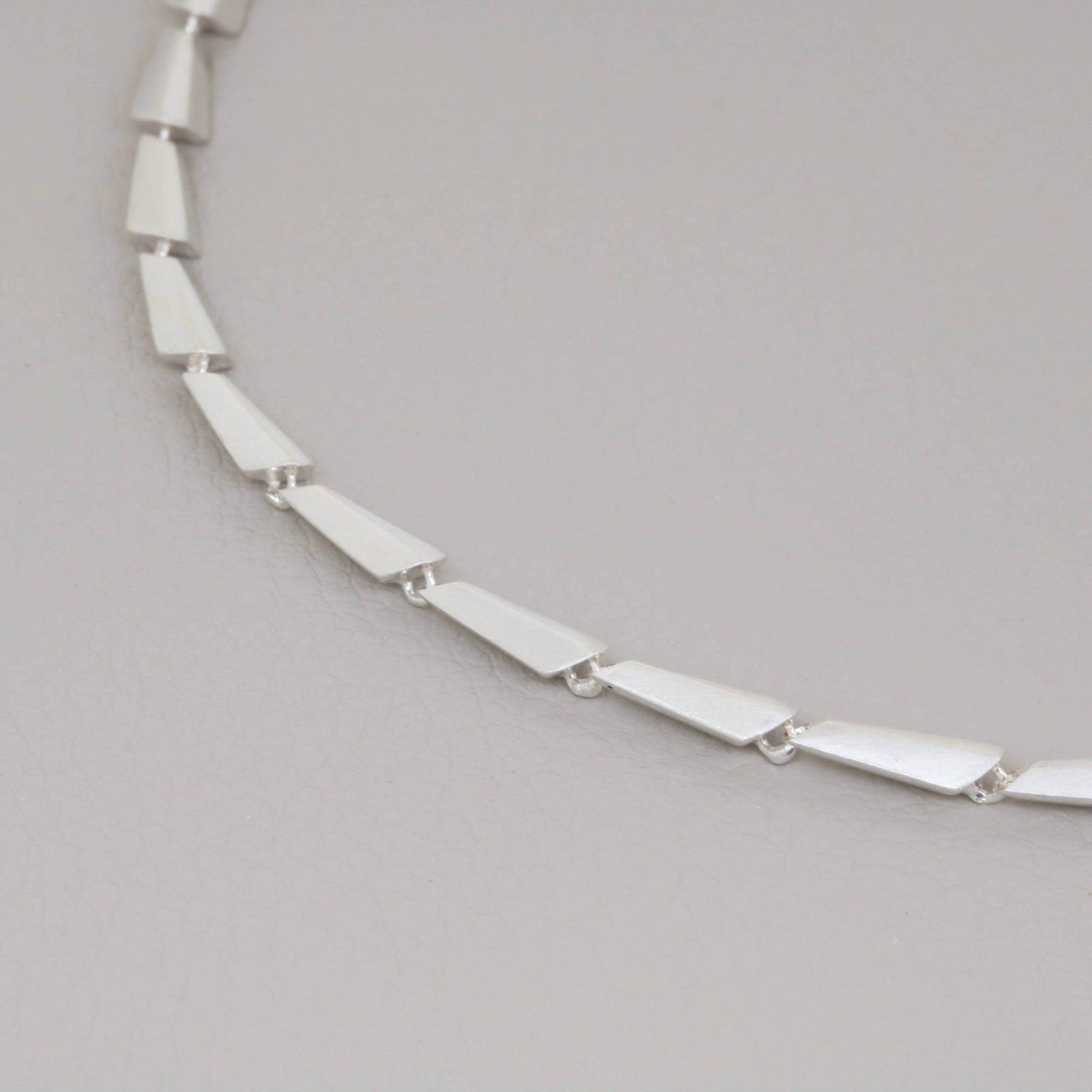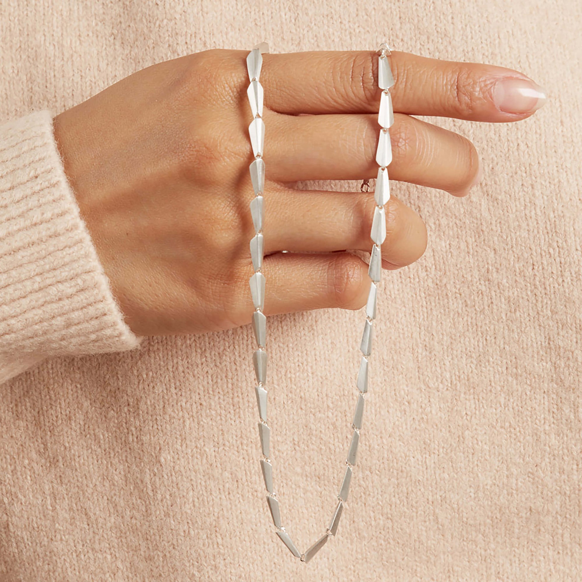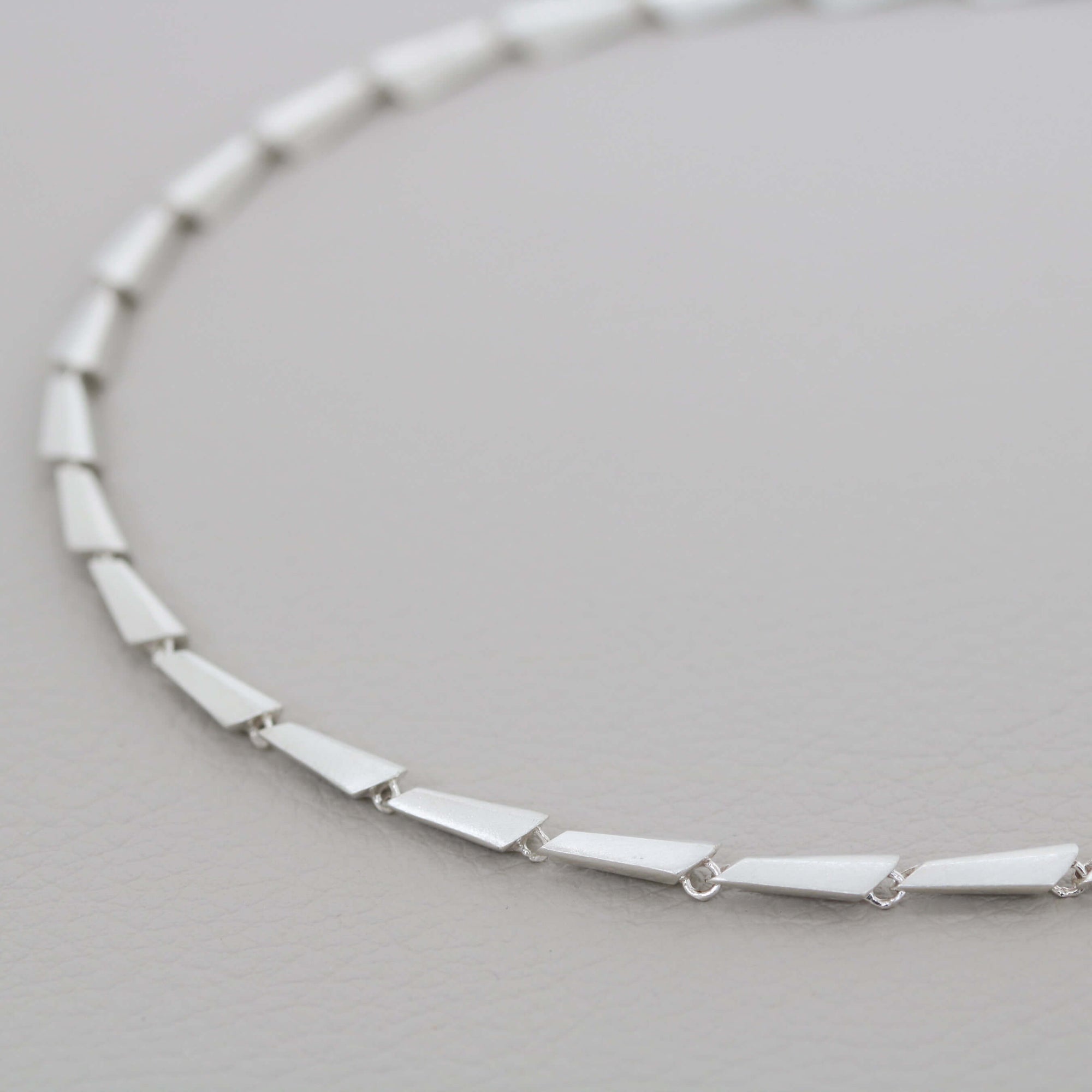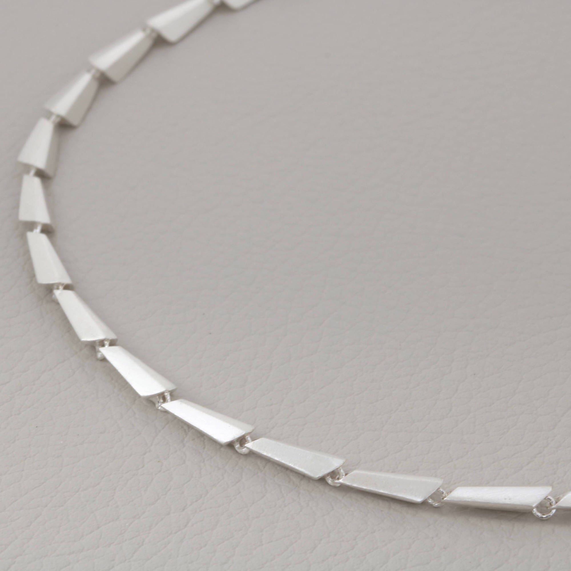 This elegant link necklace is a celebration of craftsmanship and timeless design. Inspired by the beauty of Art Deco geometry, this contemporary necklace is handmade in solid sterling silver, featuring a continuous pattern of sculptural links that catch the light beautifully. Each section has been individually cast to create a unique flowing movement, making it the perfect statement piece for everyday wear or special occasions.