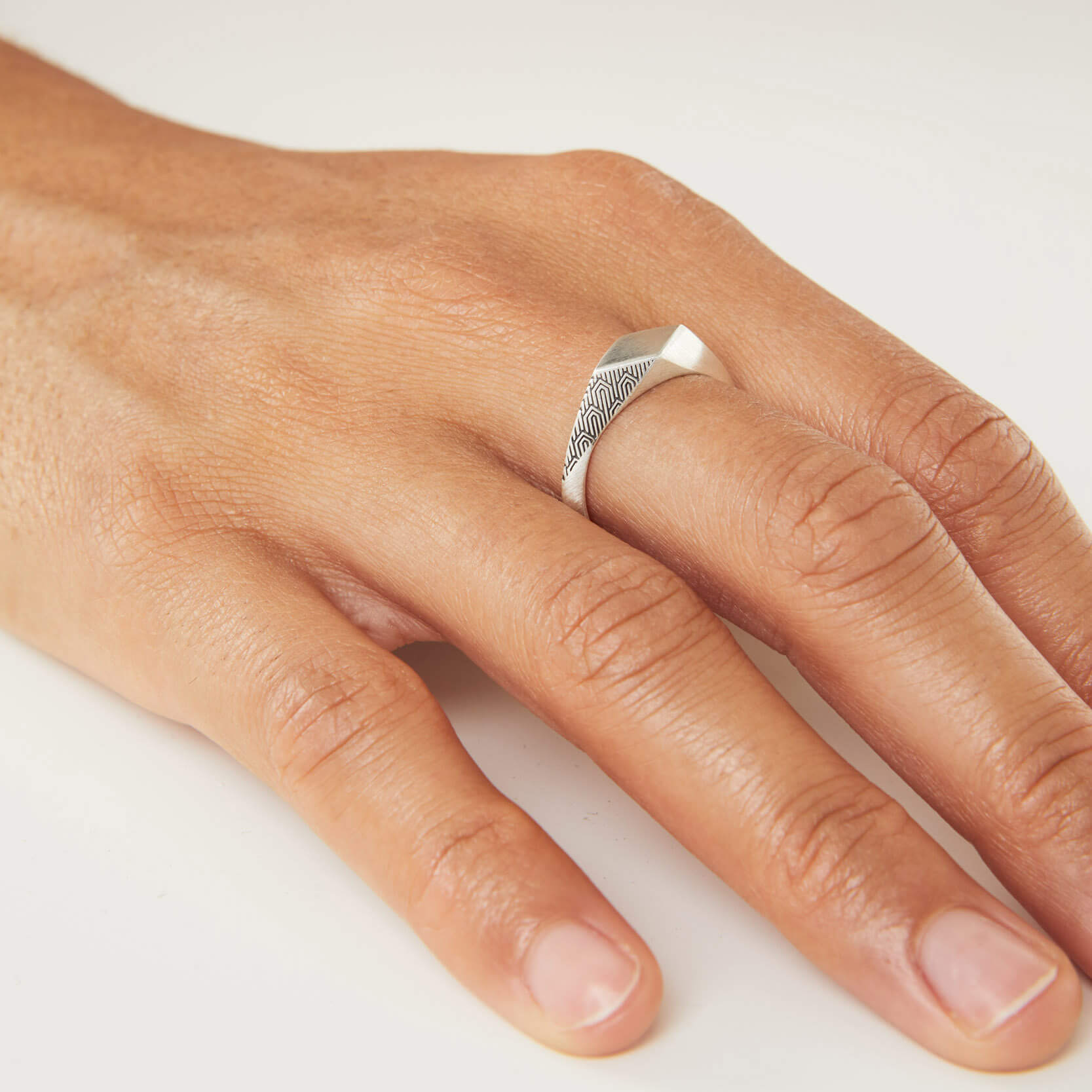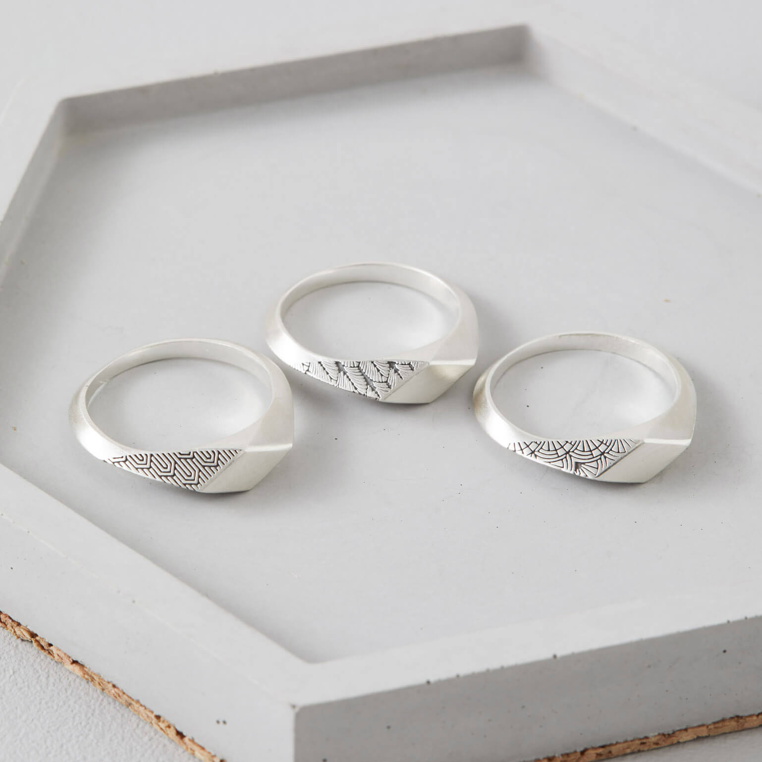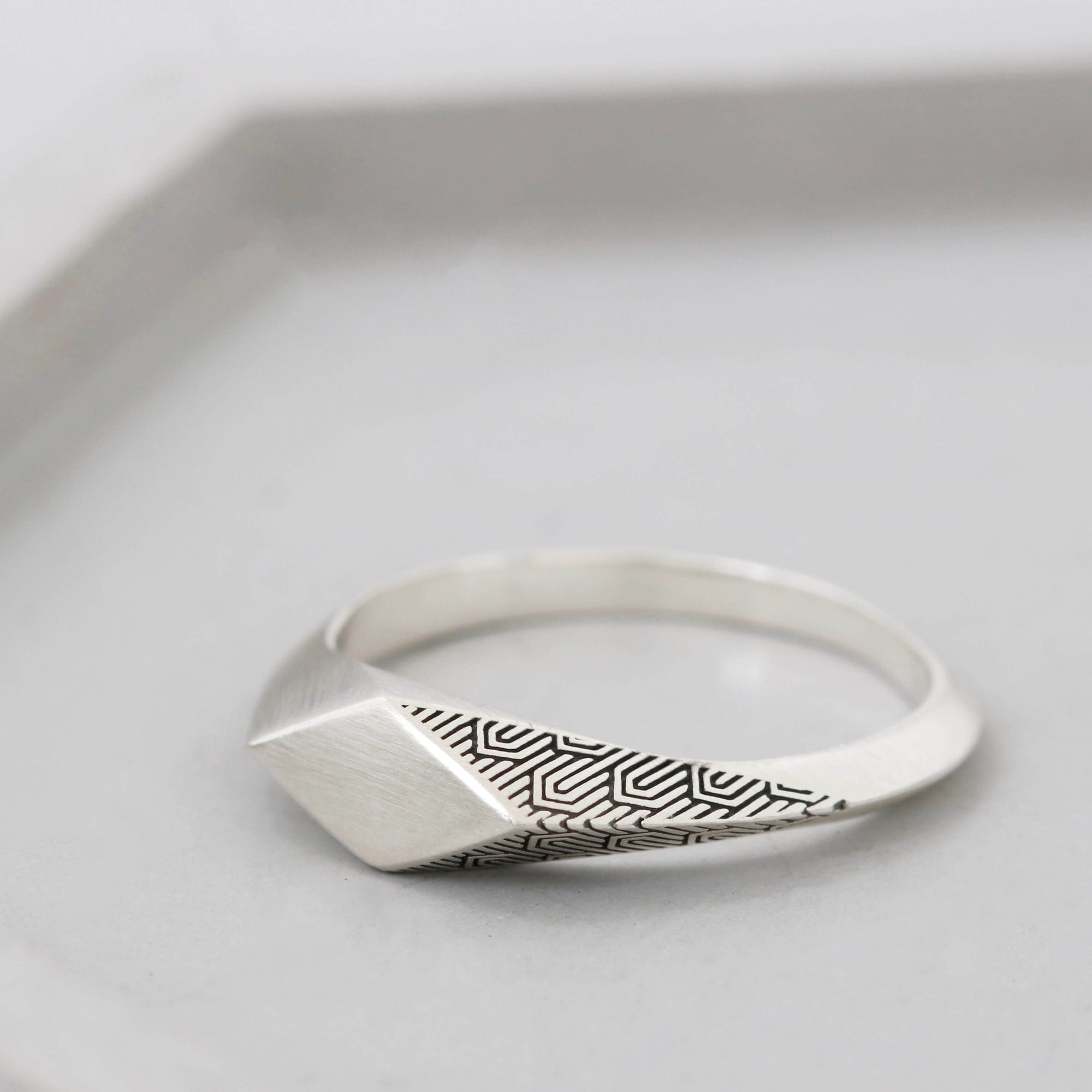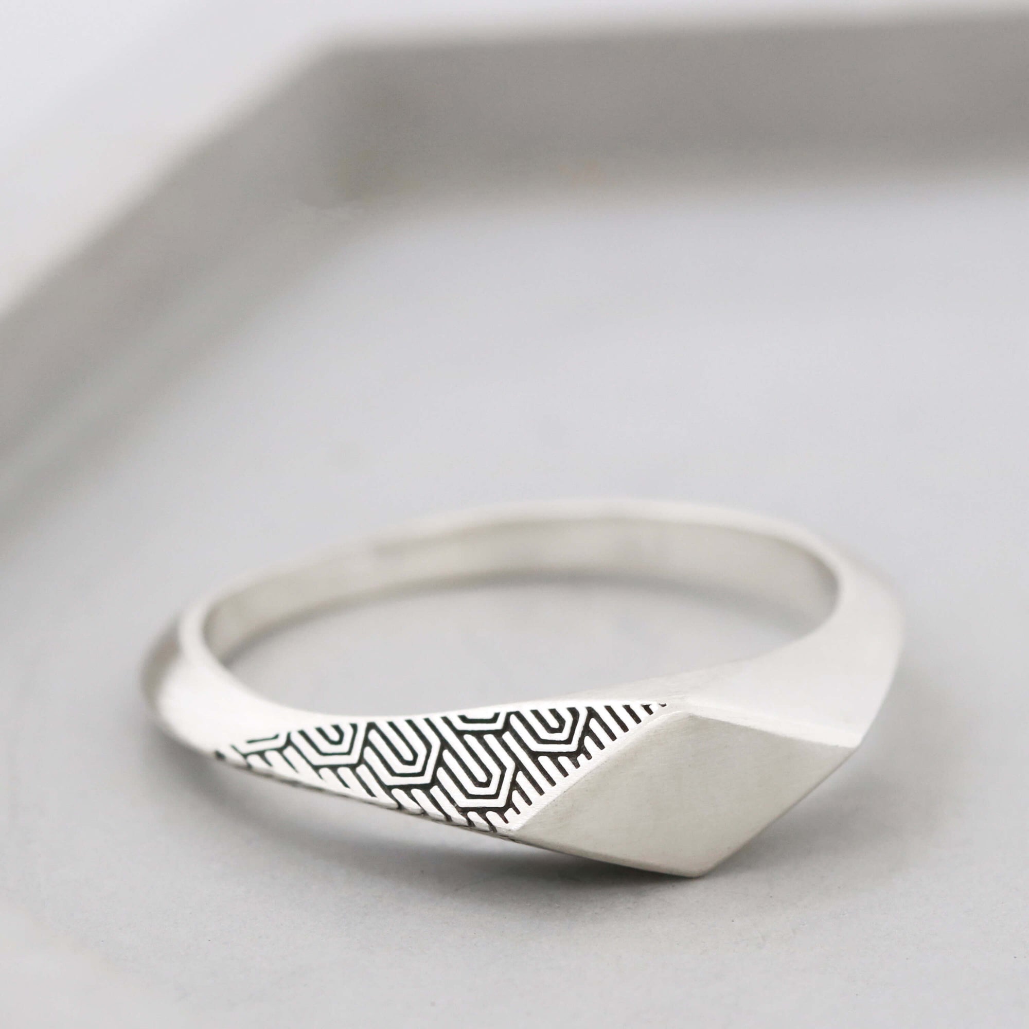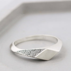 • Handmade sterling silver signet ring with a geometric chevron engraving.