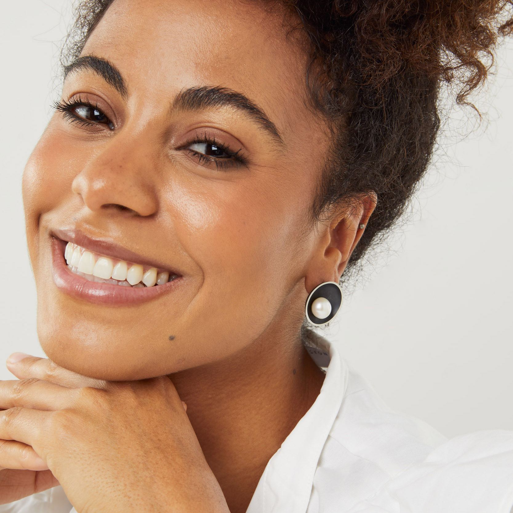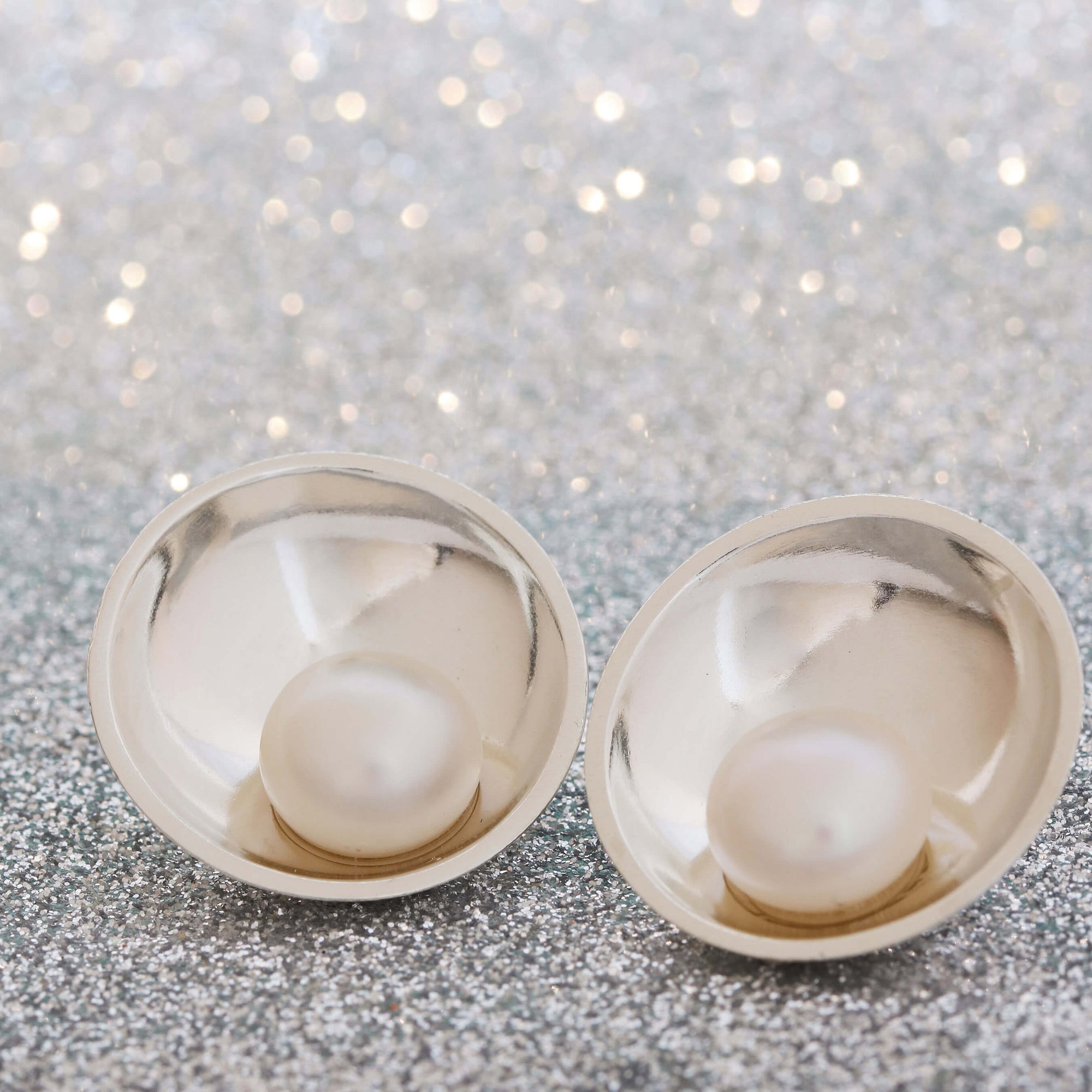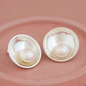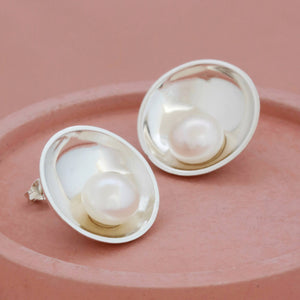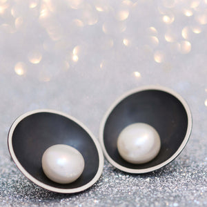These large pearl stud earrings create a stunning statement and are available in 2 finishes - Plain Silver or Silver and Black. The pearl is set within a large dome of silver with an off-centre asymmetrical position to create a really unique look