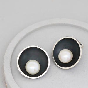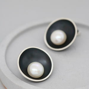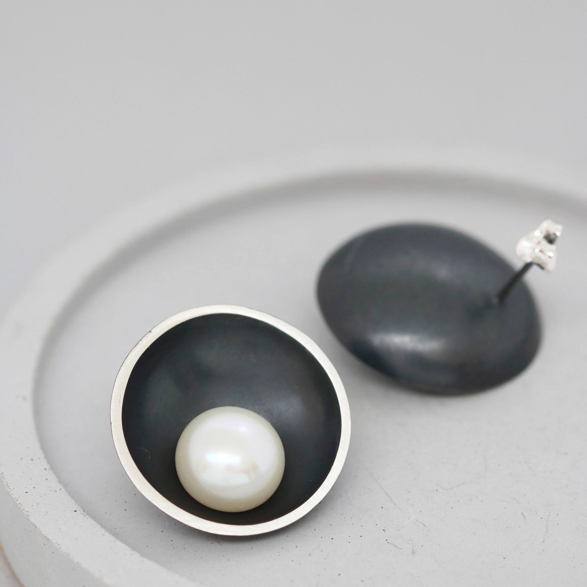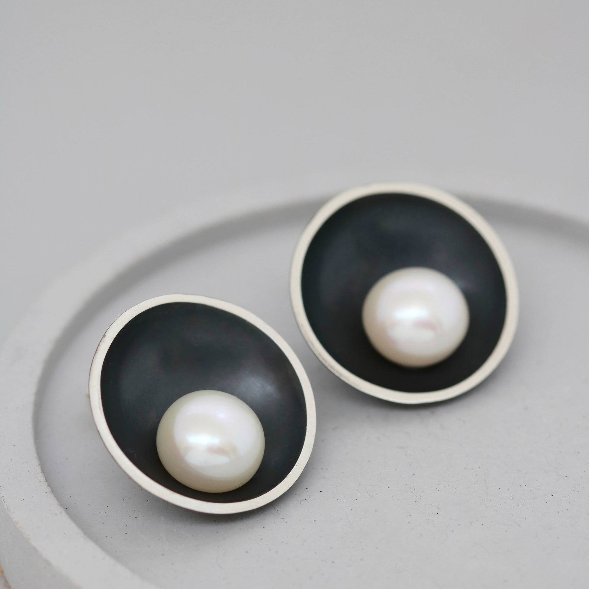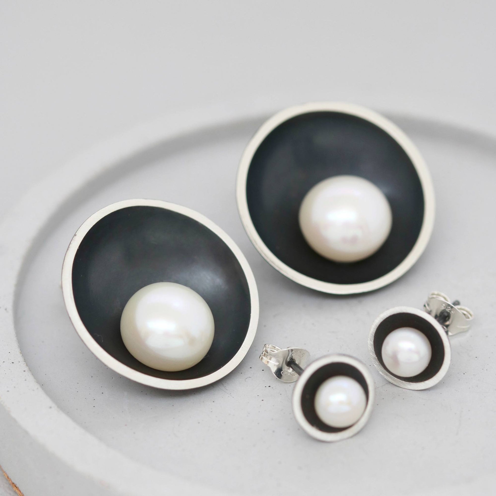 These sterling silver pearl stud earrings are essentially a larger version of my popular small pearl studs. The pearl sits in an off centre position within a circular dome of sterling silver. The design comes in your choice of 2 finishes, a plain silver version that reflects the iridescence of the pearl beautifully, or a black and silver version that creates a stunning contrast between the pearl and the silver rim of the dome.