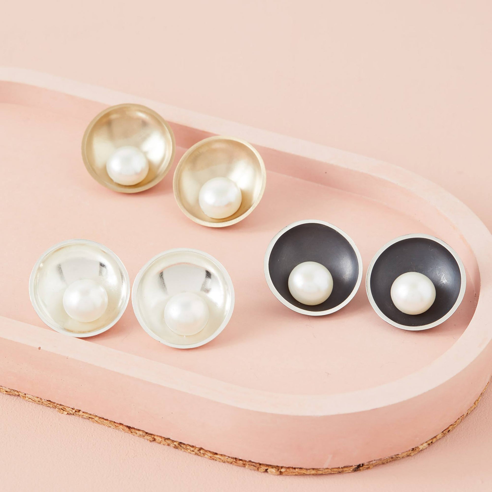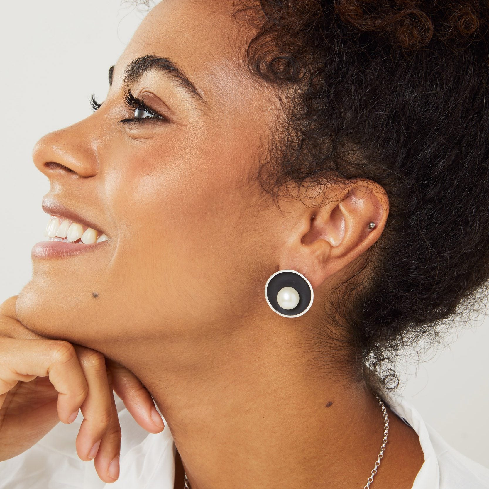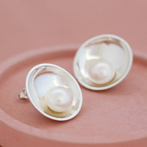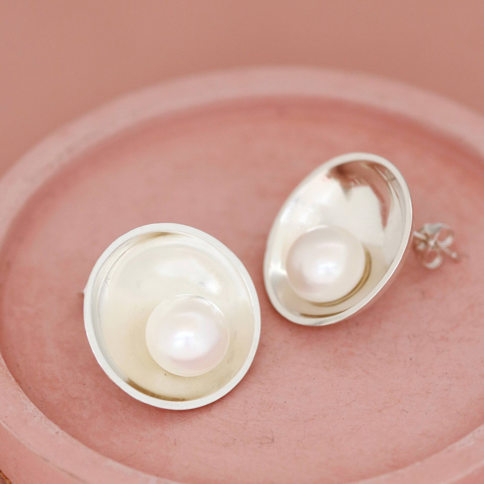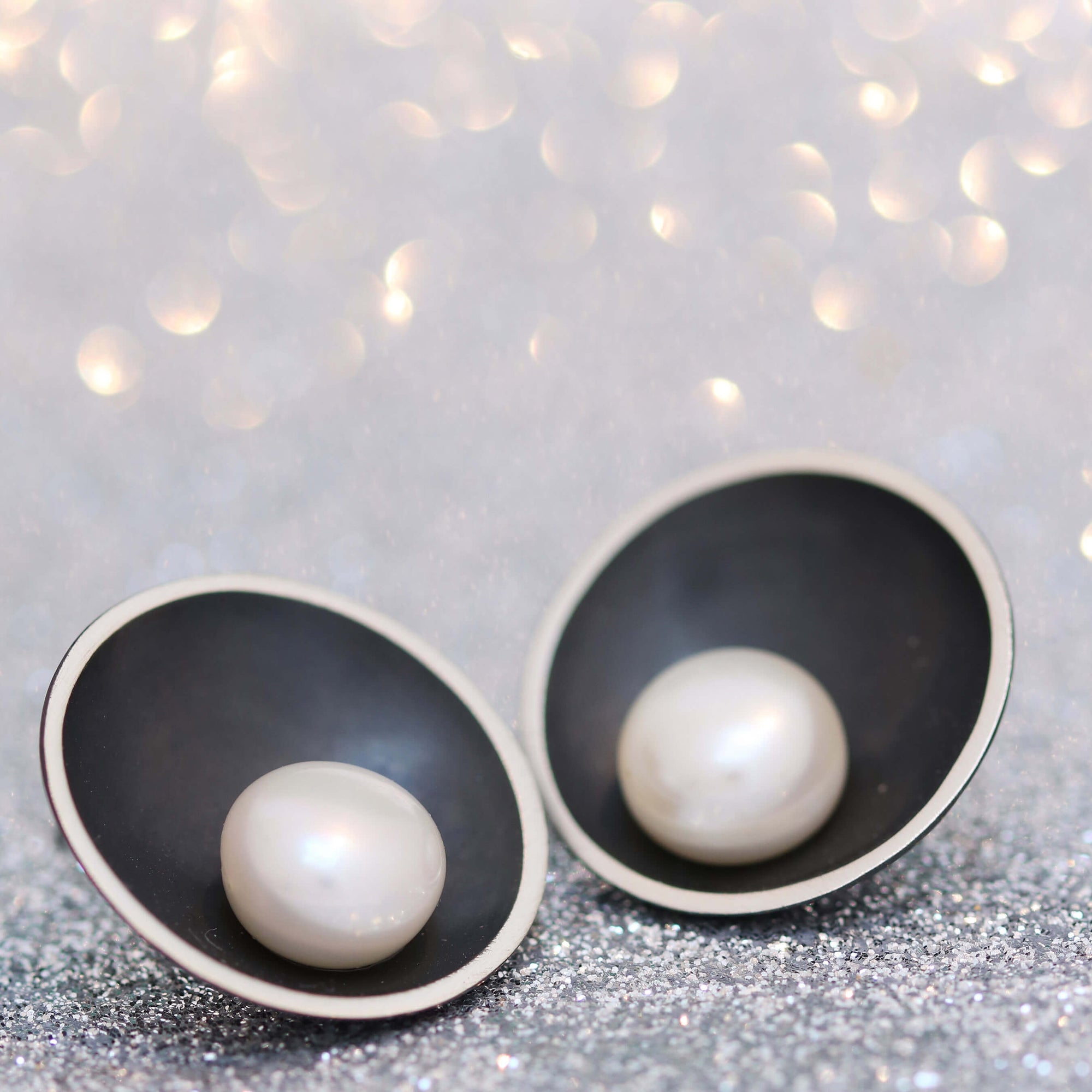 These sterling silver pearl stud earrings are essentially a larger version of my popular small pearl studs. The pearl sits in an off centre position within a circular dome of sterling silver. The design comes in your choice of 2 finishes, a plain silver version that reflects the iridescence of the pearl beautifully, or a black and silver version that creates a stunning contrast between the pearl and the silver rim of the dome.