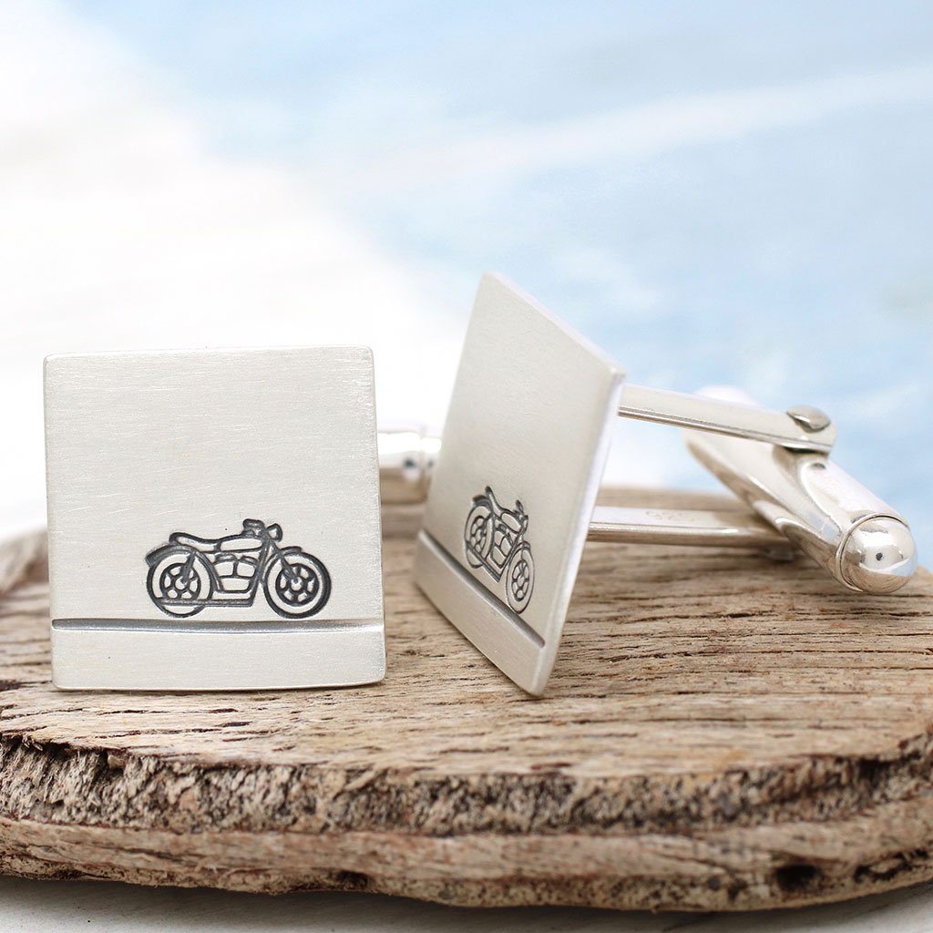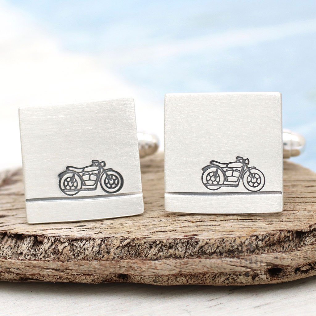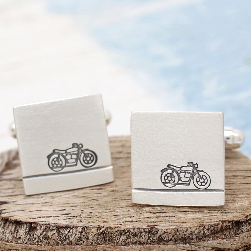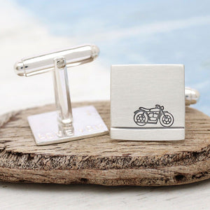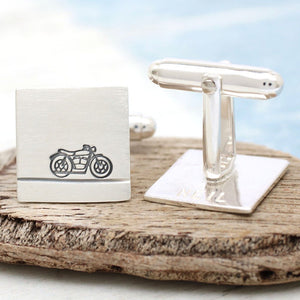 Motorbike cufflinks handmade in sterling silver and personalised on the reverse – the perfect gifts for a biker dad, groom, or husband who loves motorcycles.