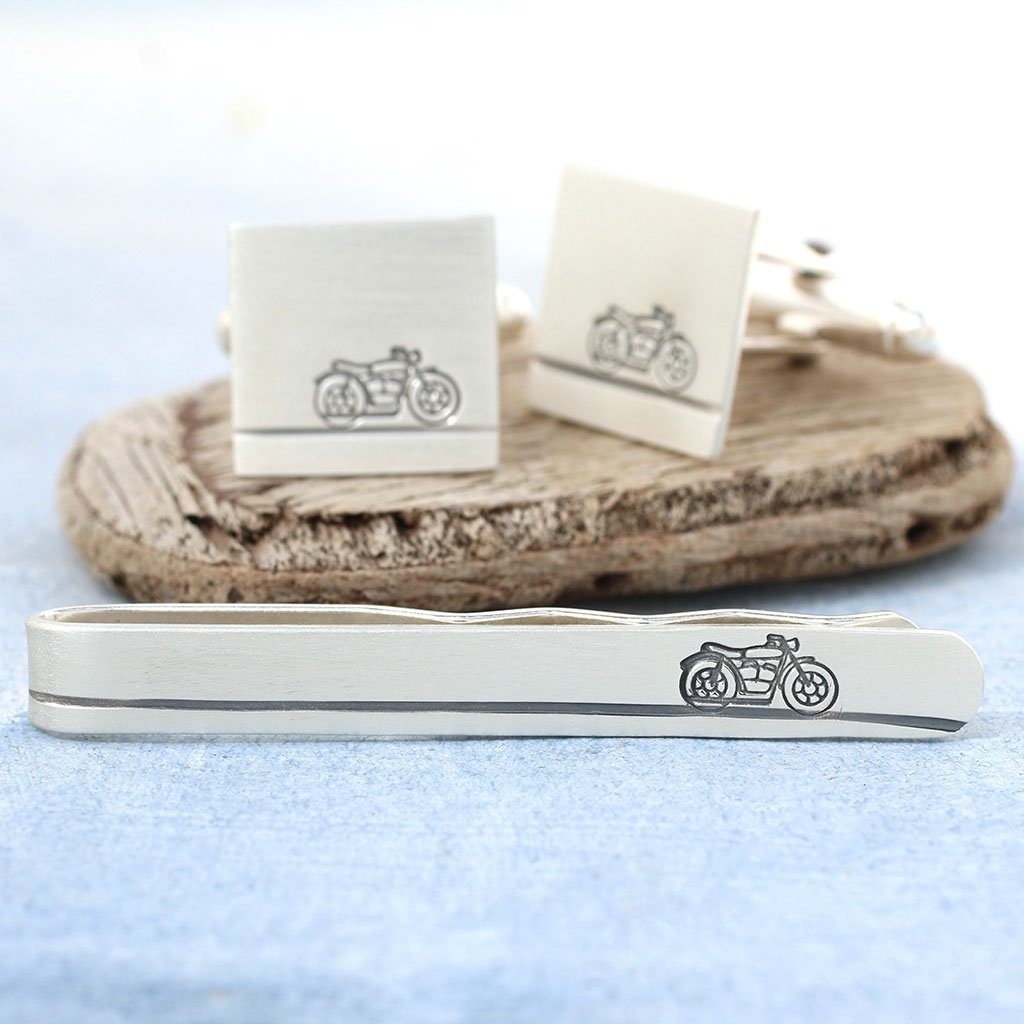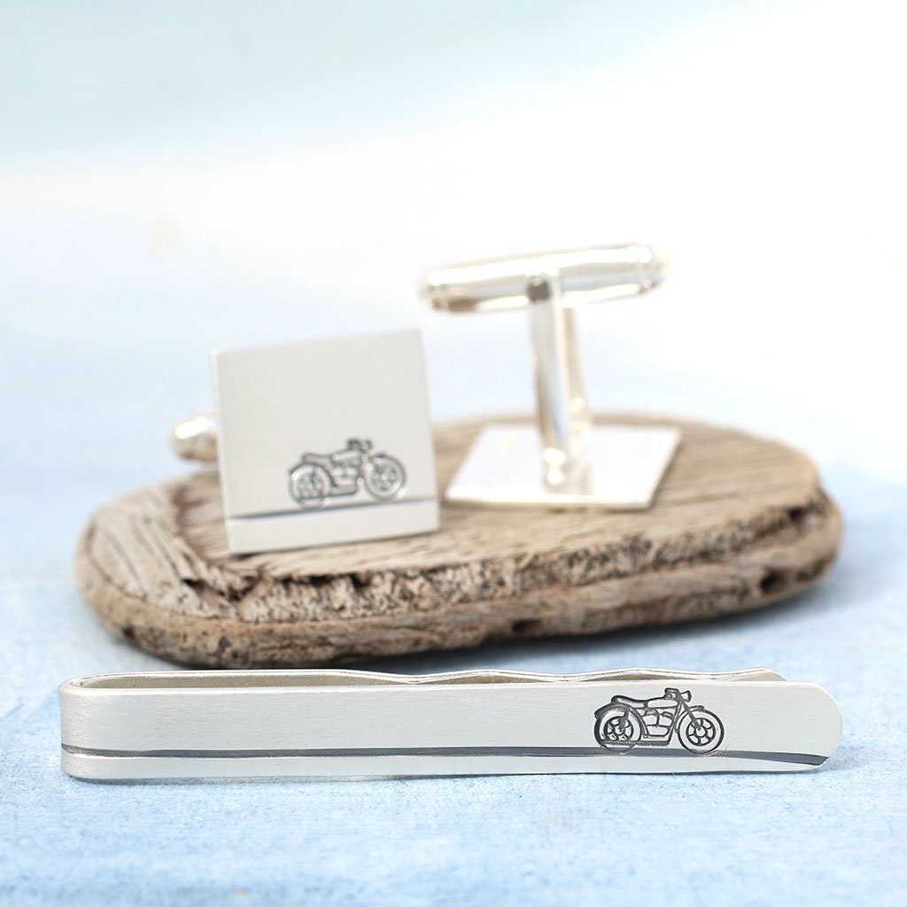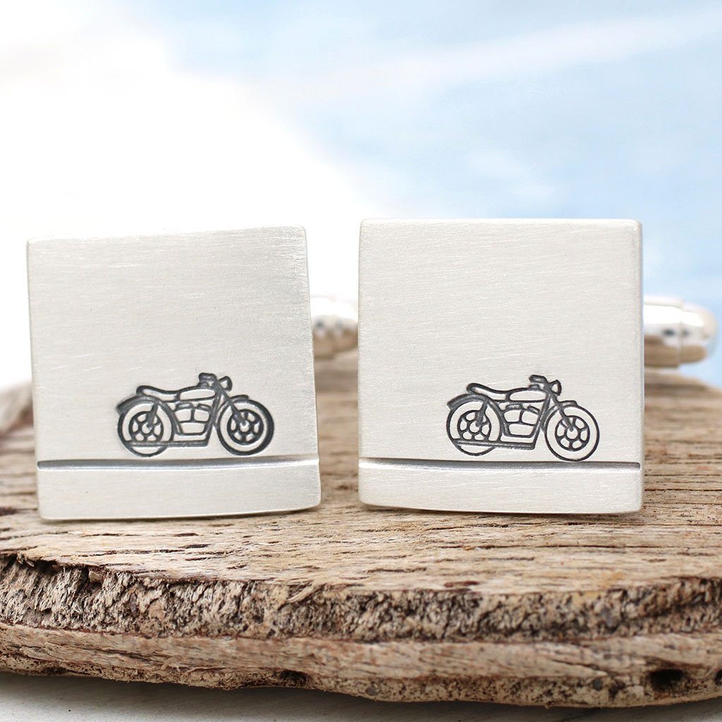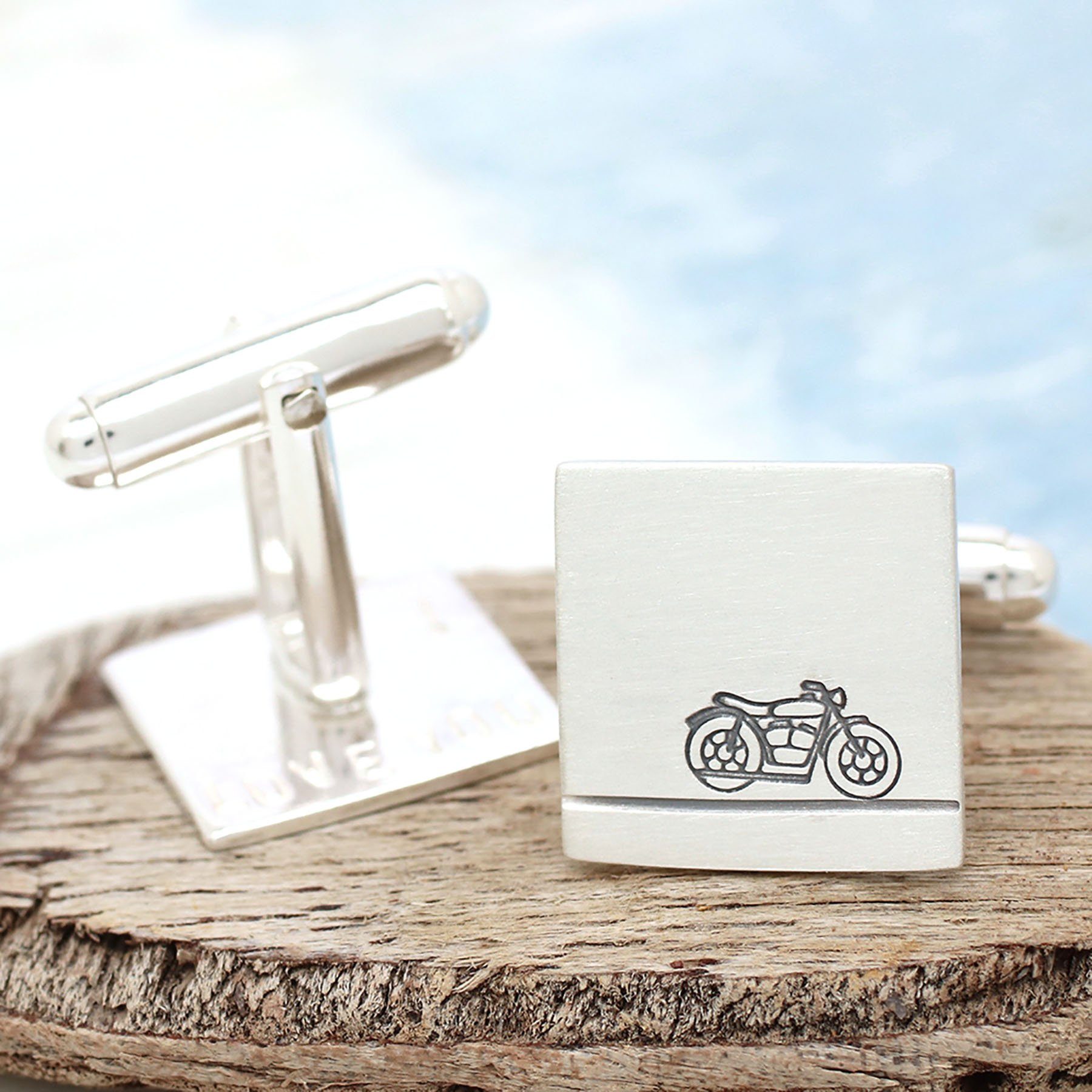 Motorbike cufflinks handmade in sterling silver and personalised on the reverse – the perfect gifts for a biker dad, groom, or husband who loves motorcycles.