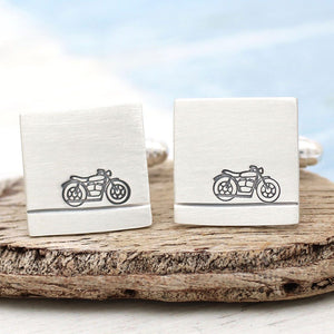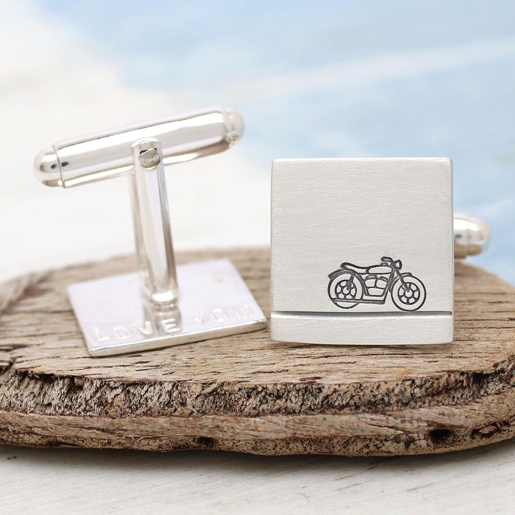 Motorbike cufflinks are the ultimate gifts for a biker dad, groom, or motorcycling enthusiast who wants to wear their passion proudly. Handmade in solid sterling silver and finished with a distinctive matte texture, these cufflinks feature a hand-stamped motorcycle design on the front and can be personalised with a secret message on the reverse. Whether you're looking for a meaningful wedding day gift, a special birthday present, or a Father’s Day treasure, these custom cufflinks combine sentimentality with style.