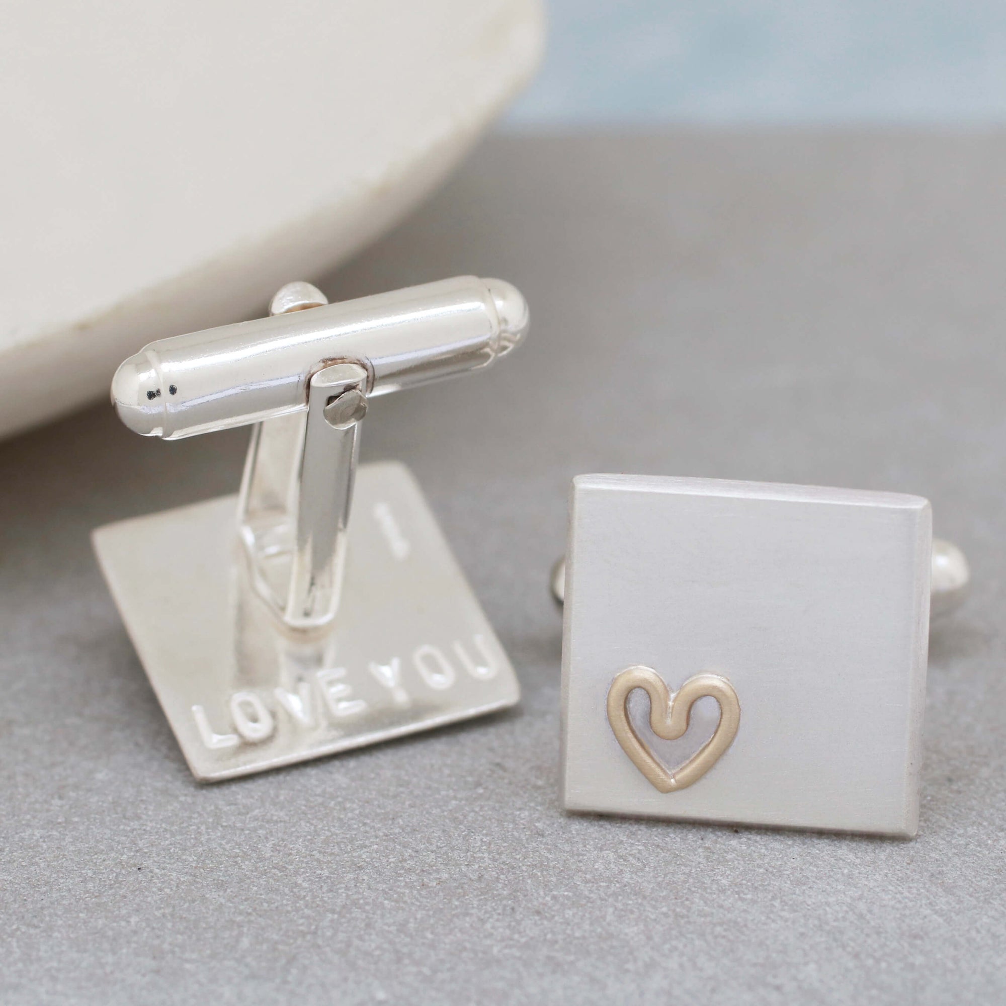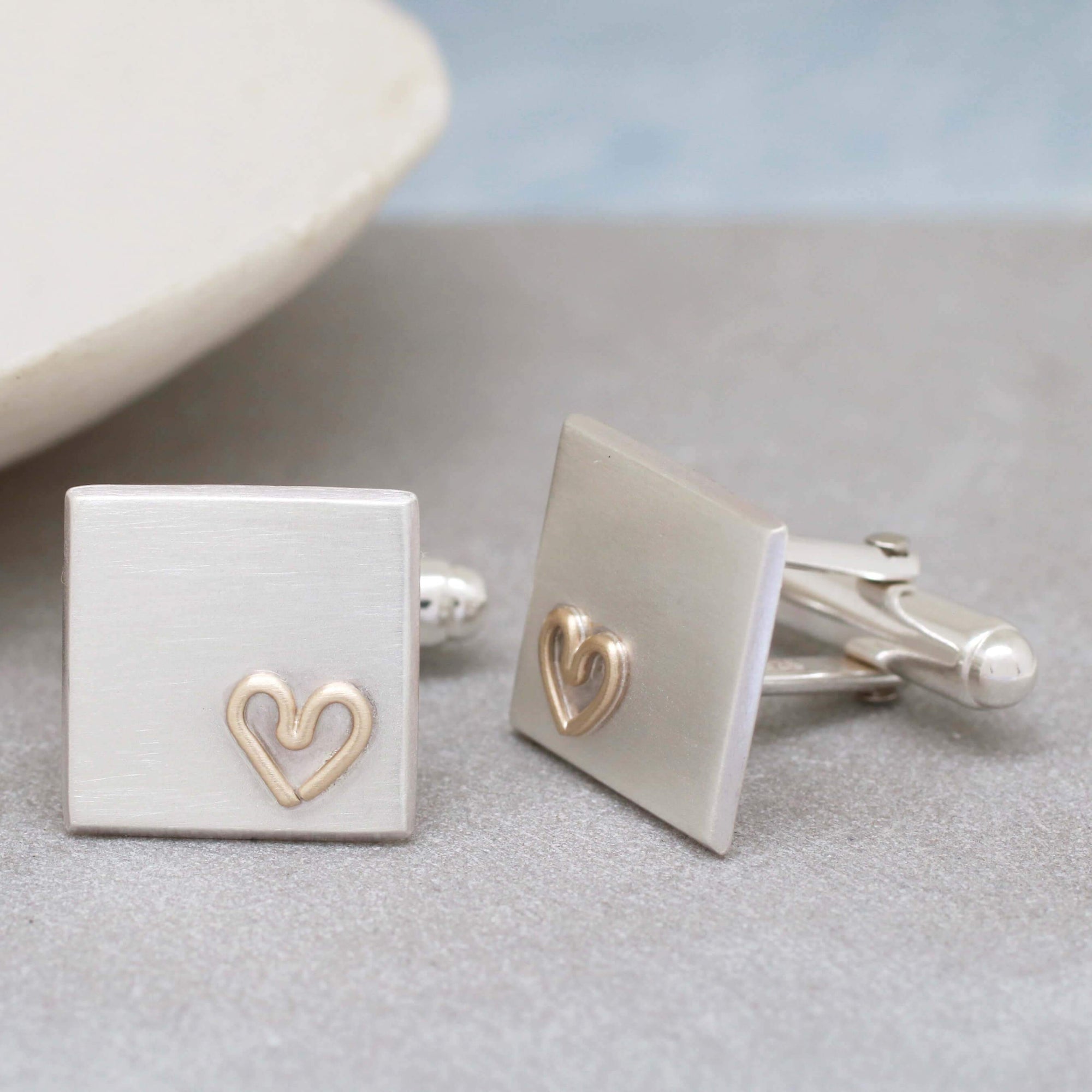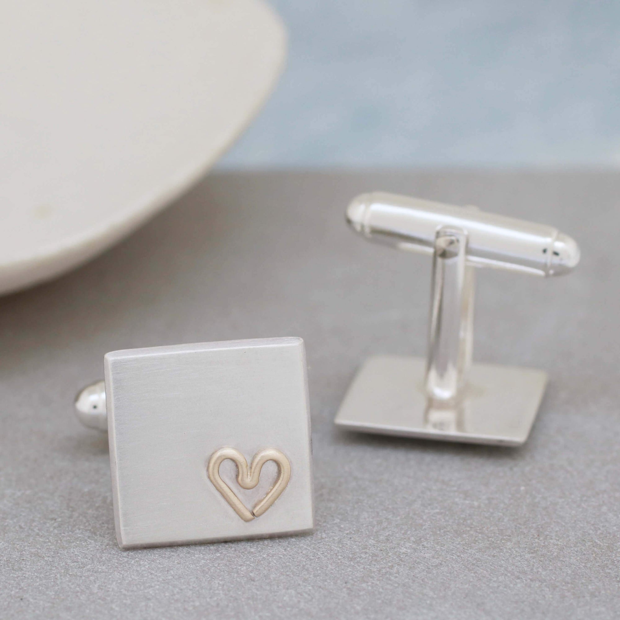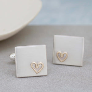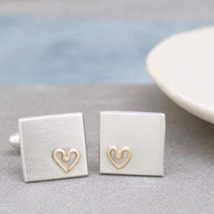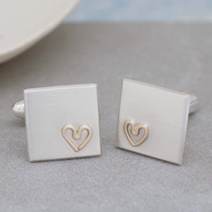 Handmade in solid sterling silver with a 9ct yellow gold heart symbol and a simple silver round bar spring cufflink fitting for comfort and security.