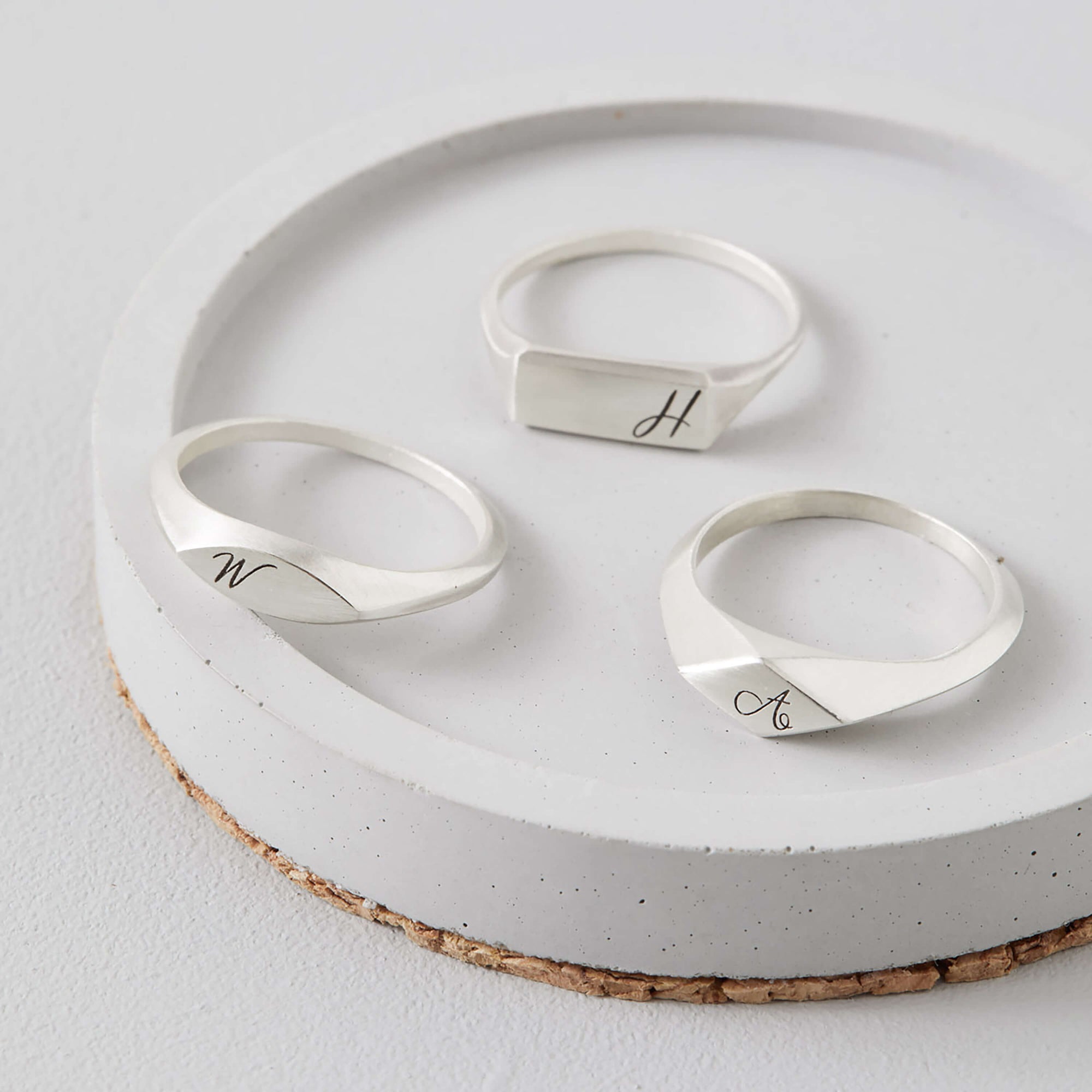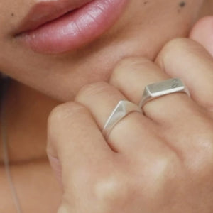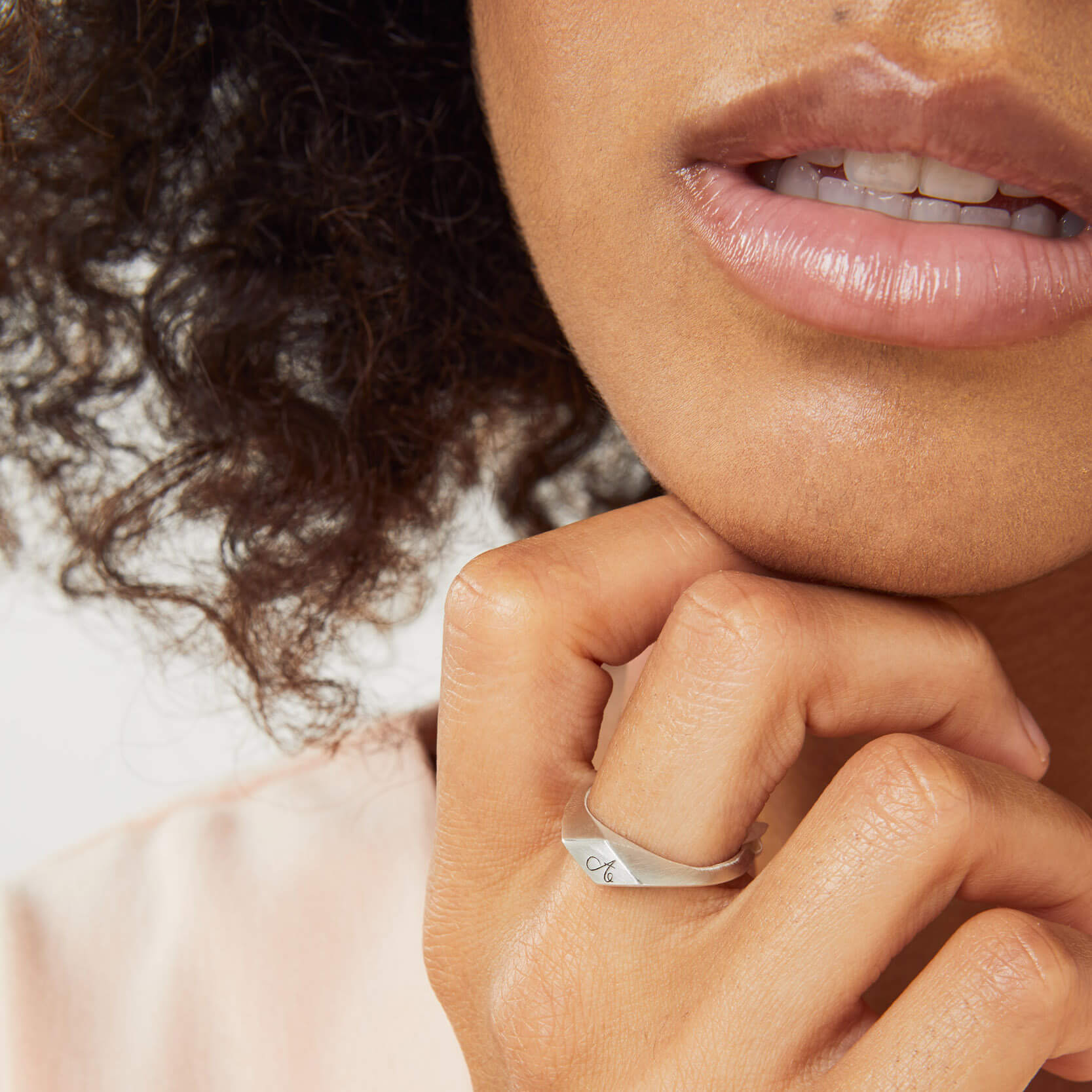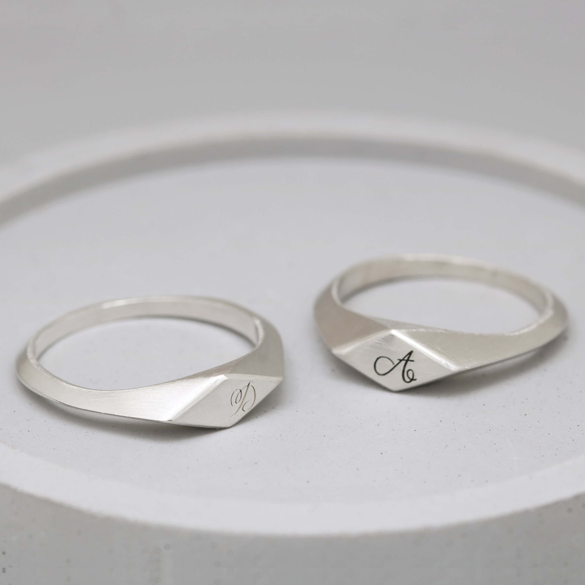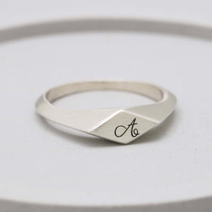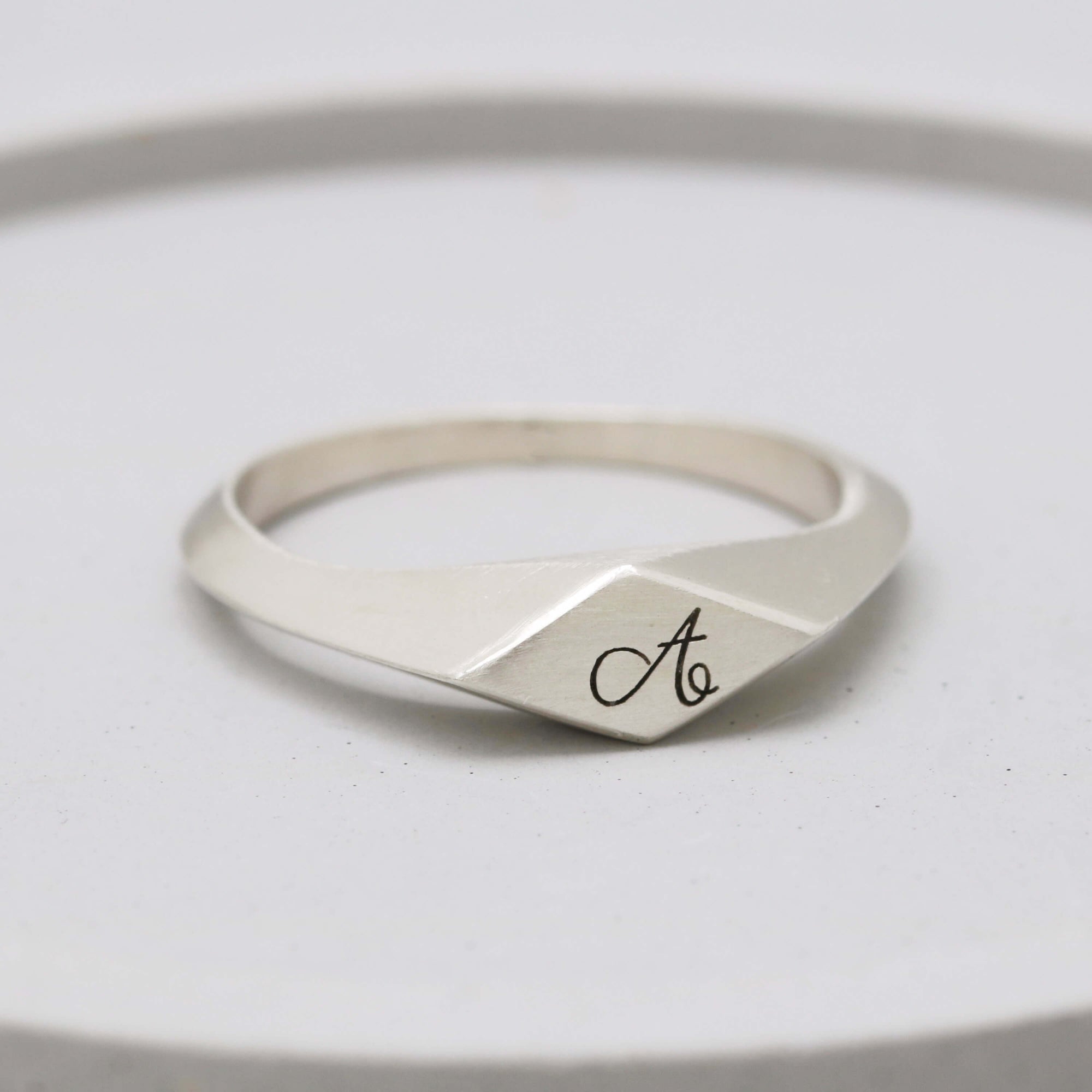 A signet ring personalised with your chosen initial, this sleek sterling silver design blends modern elegance with timeless charm. The striking kite-shaped silhouette, inspired by geometric art deco styles, creates a bold yet delicate statement. Whether worn as a ring with initial for a subtle personal touch or as a stylish pinky ring, this piece is made to be treasured.
