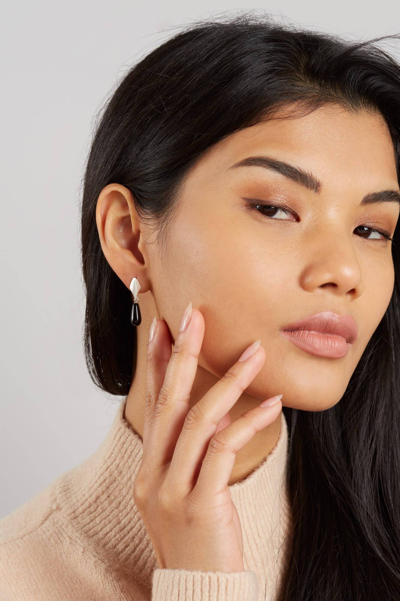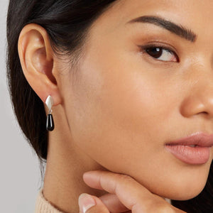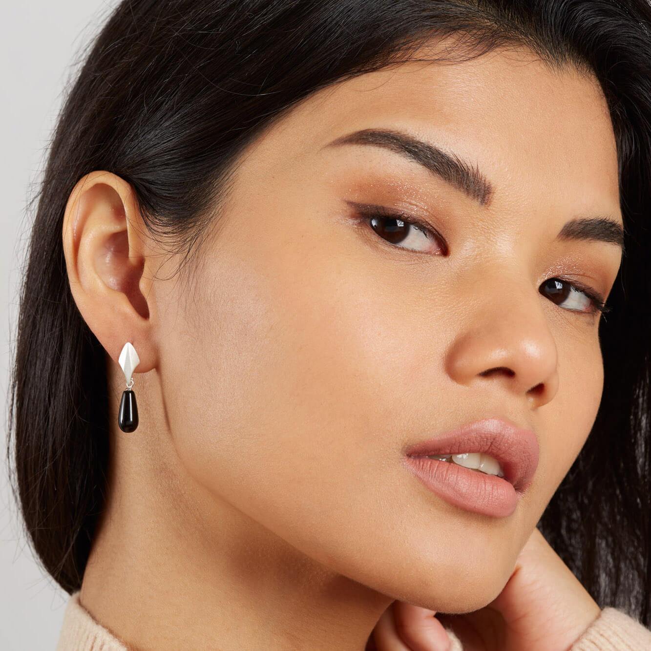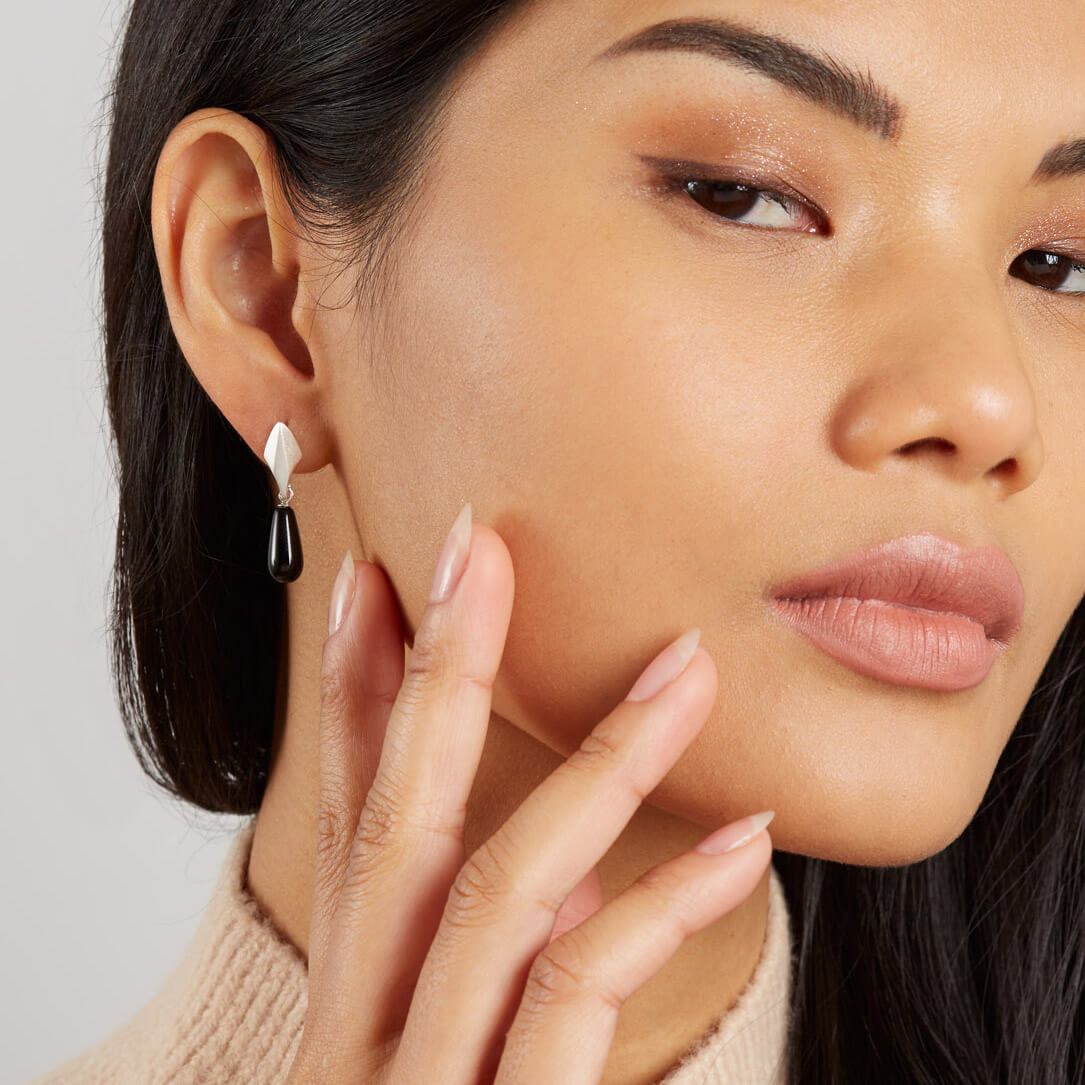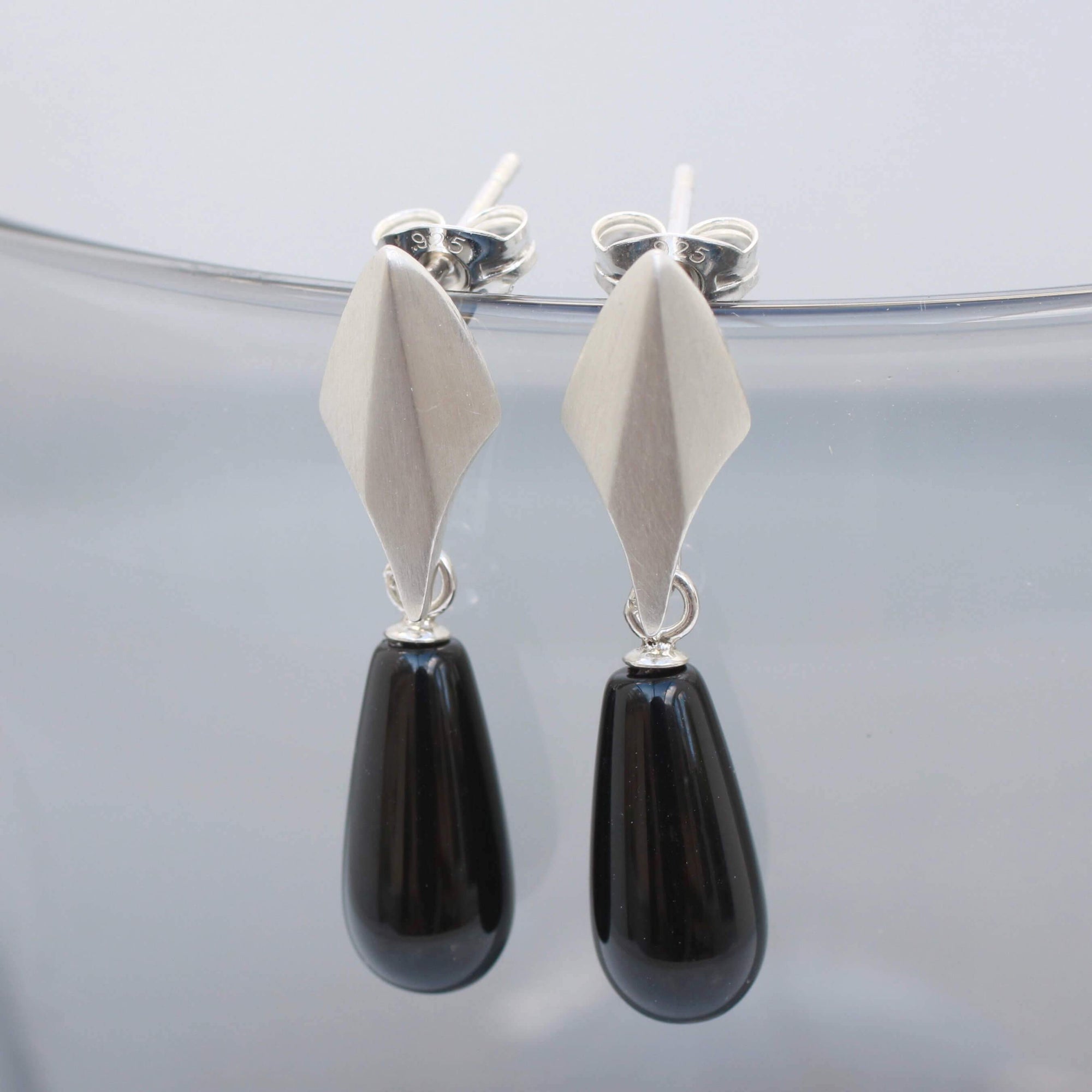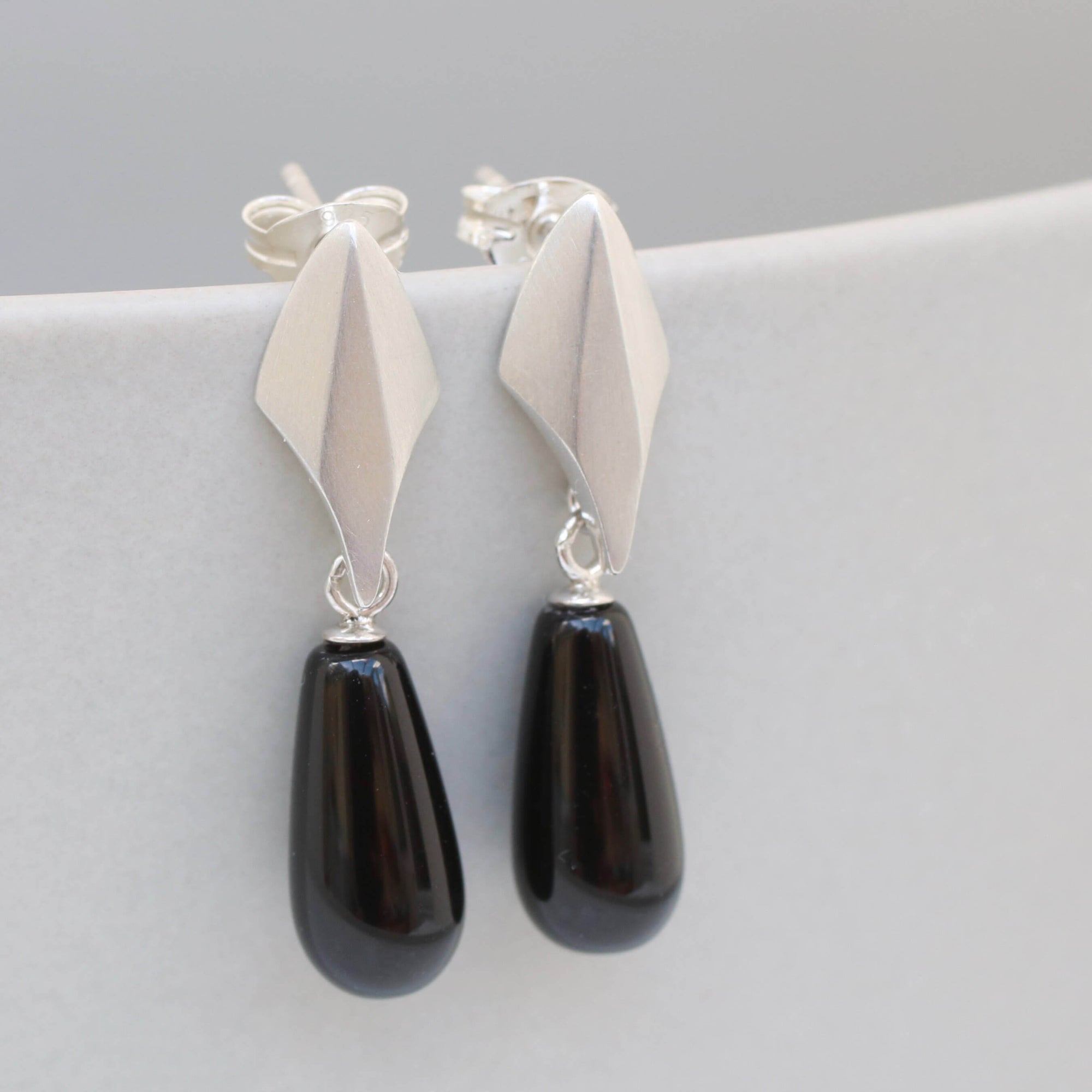 The silver accent was originally hand carved in wax before being cast in silver, the geometric shape of these earrings celebrates the lines and shapes found in Art Deco design and accentuates the dark intensity of the onyx gemstone.