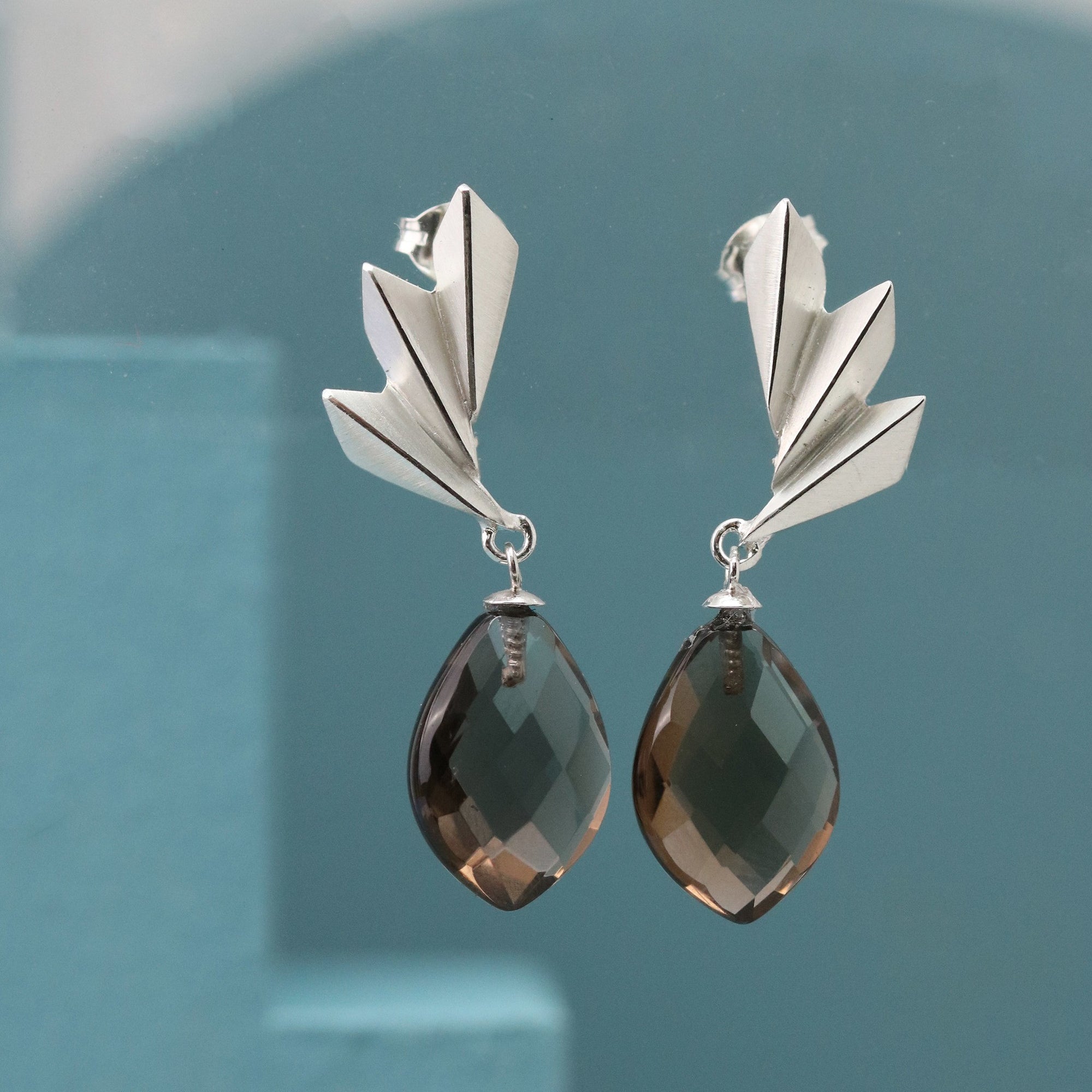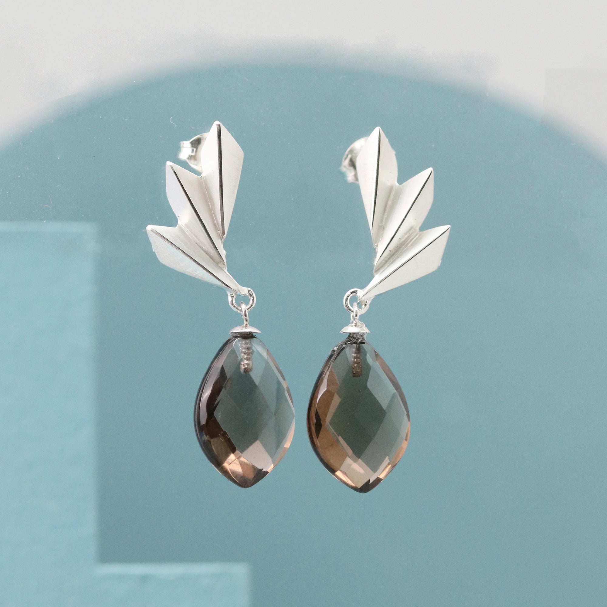 I designed these earrings to fuse the structure of Art Deco shapes with the deep, subtle glow of smoky quartz. The geometric silver detail reflects the light beautifully, while the gemstone adds warmth and movement. They’re bold but wearable, making them perfect art deco statement earrings you’ll reach for time and time again.