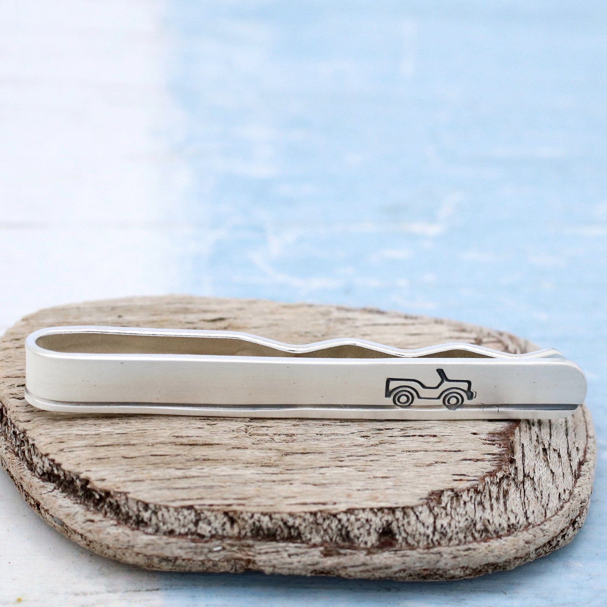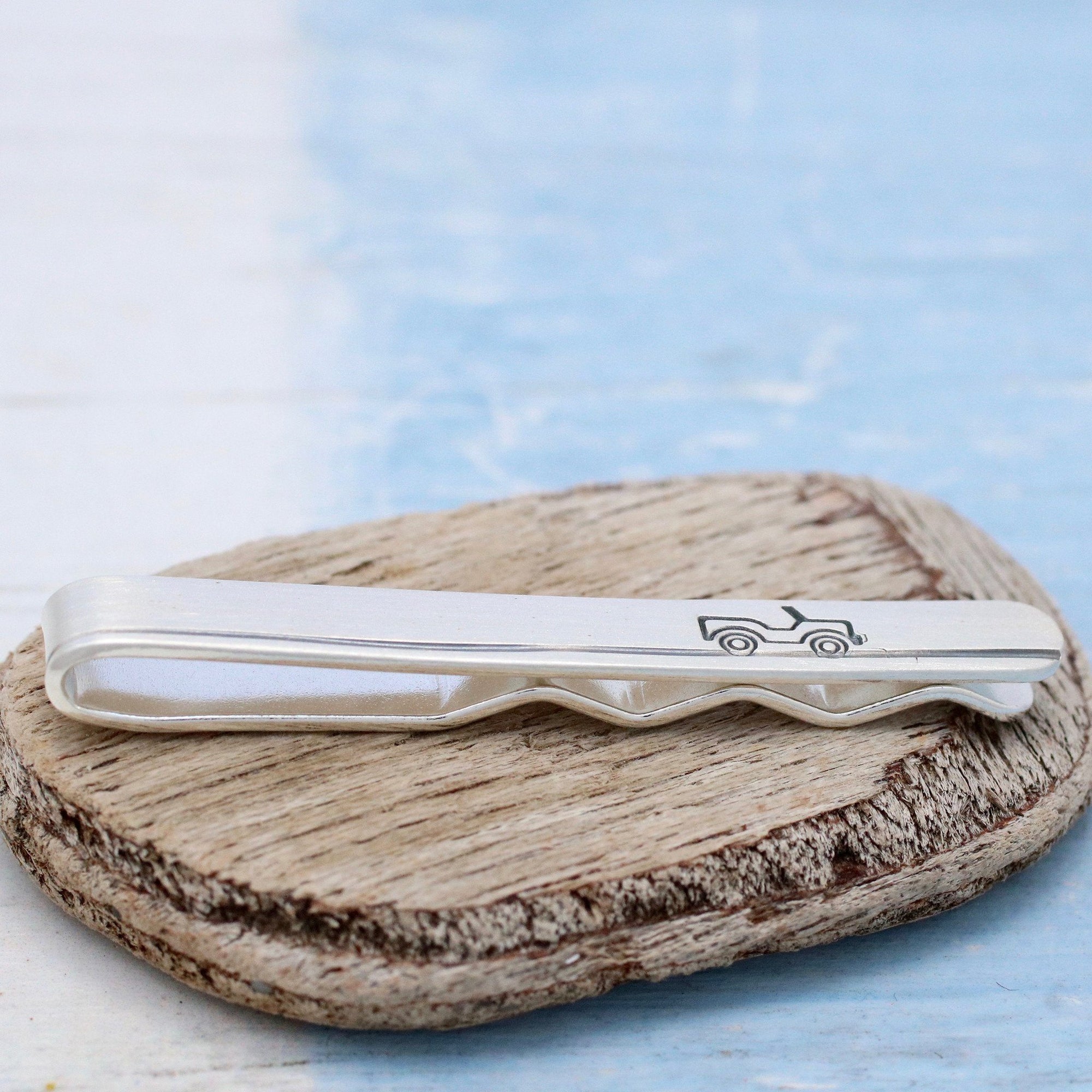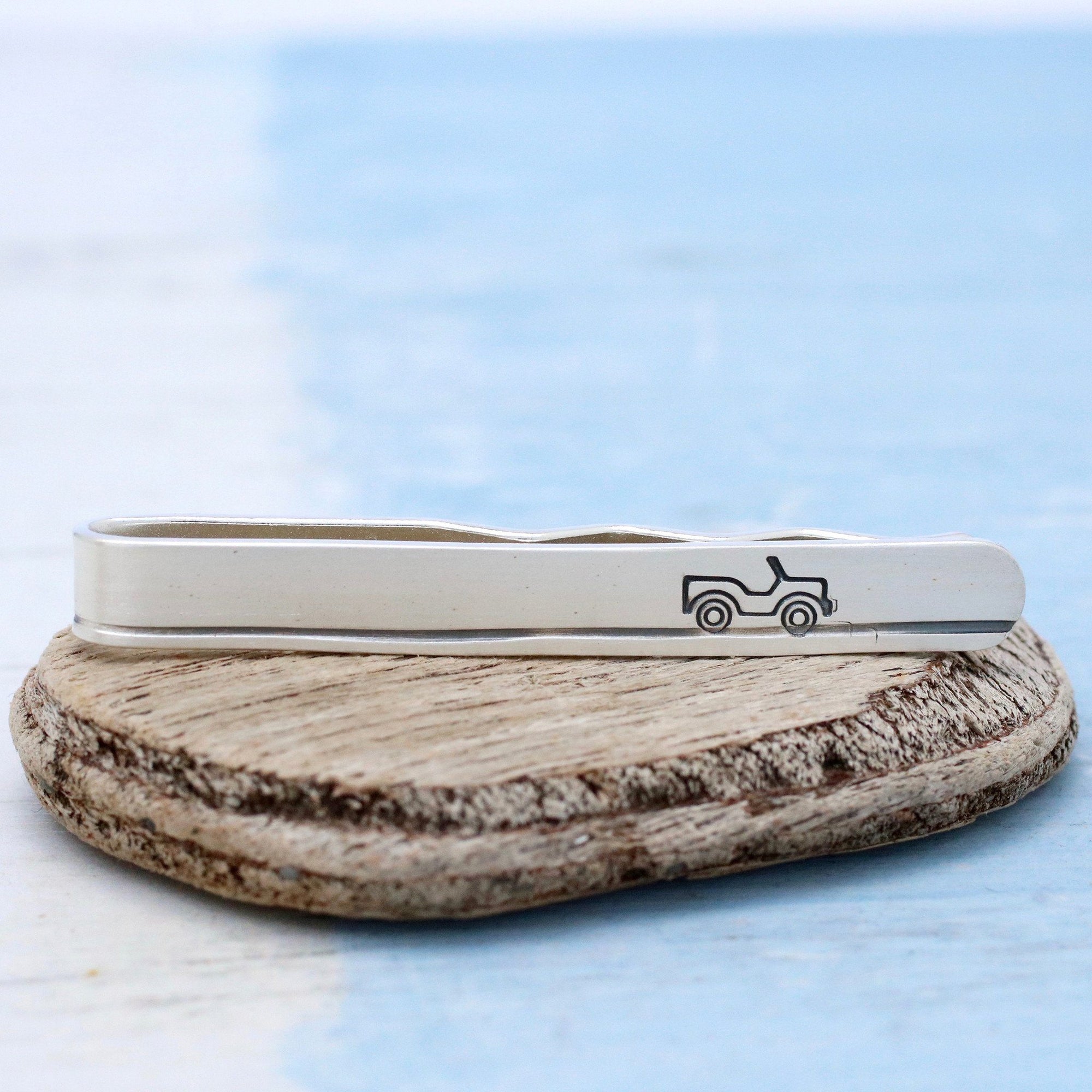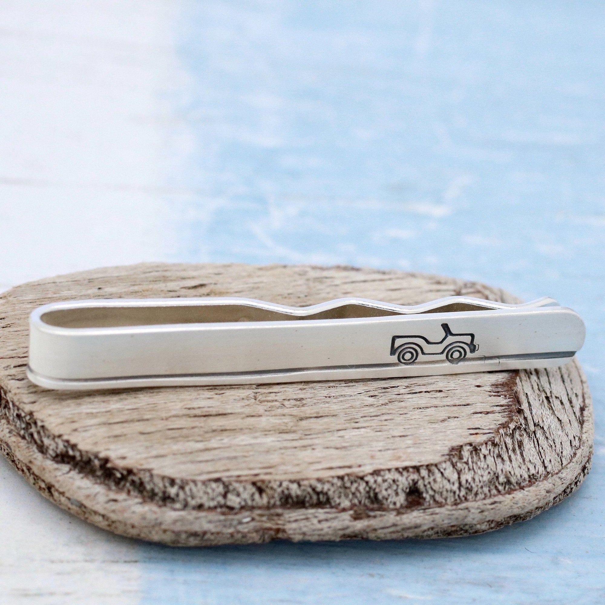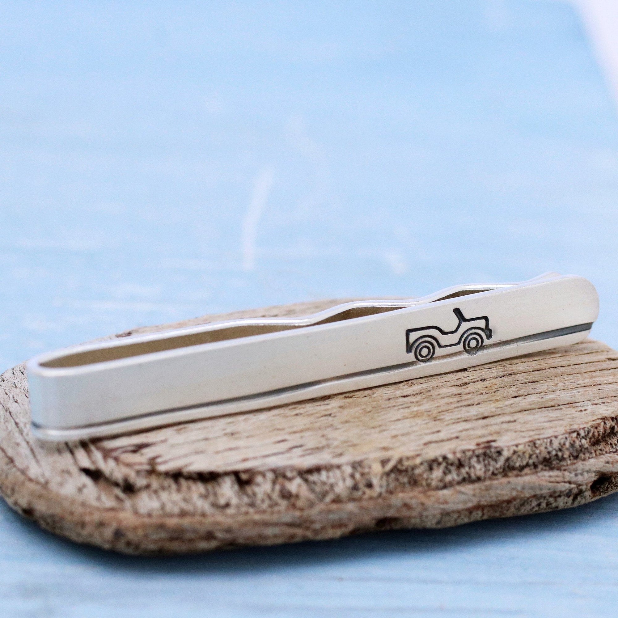 Perfect gift for him these car tie clips are hand-stamped in sterling silver. Gift for Dad or wedding tie clip for the 4x4 mad groom.