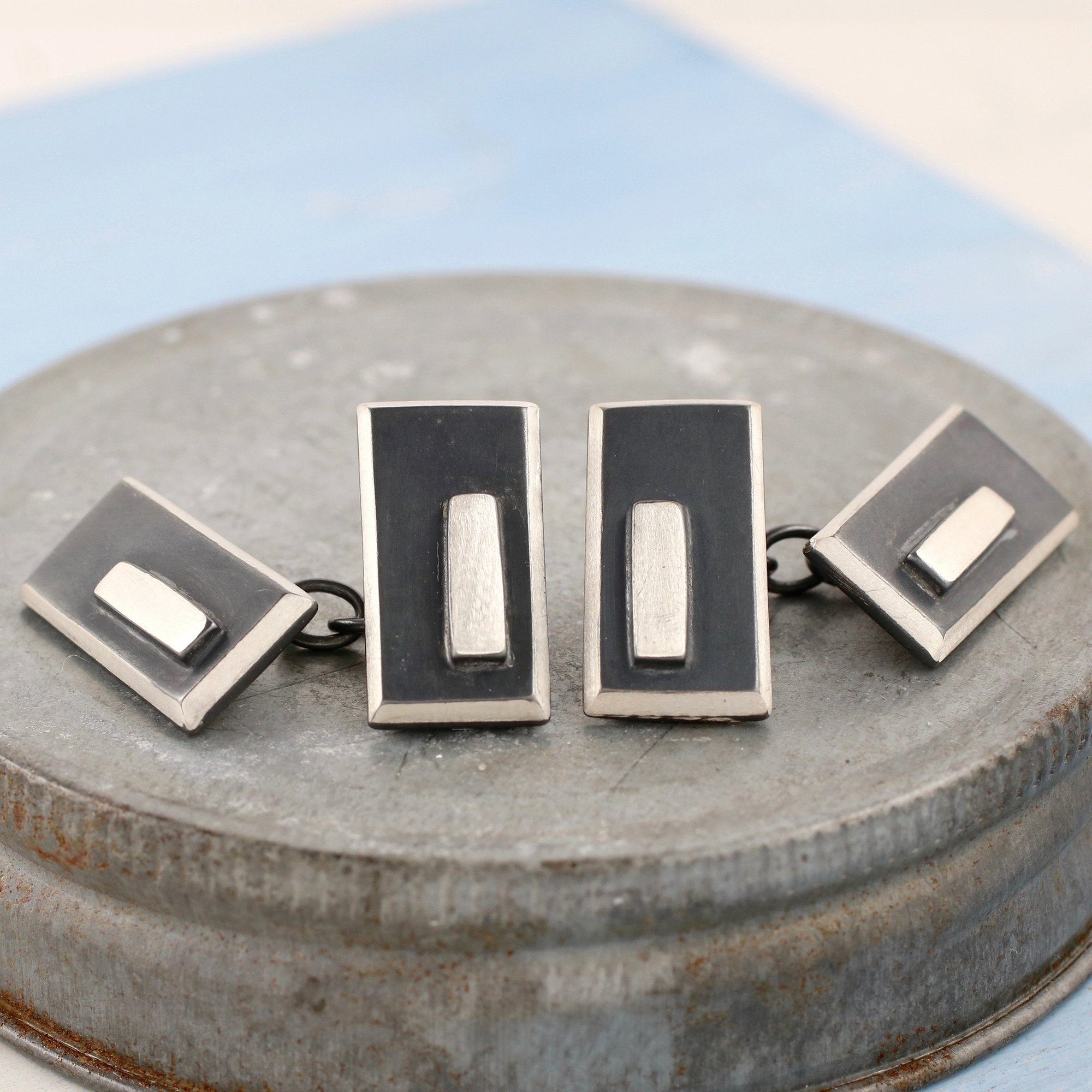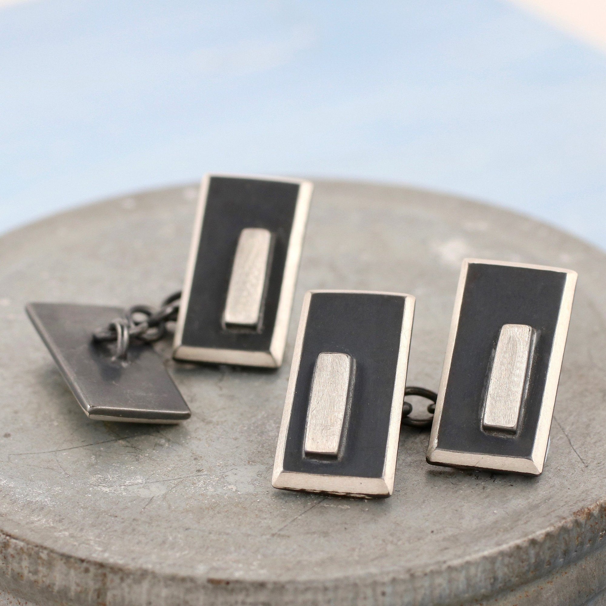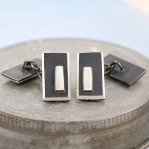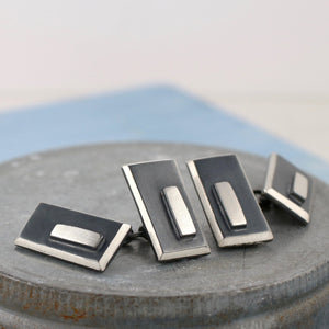 The silver is oxidised to create the contrasts giving a striking modern cufflink against a fresh tailored shirt.