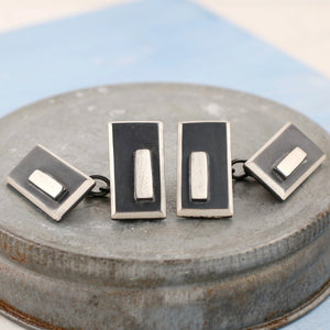 Using simple geometric shapes and strong black and silver contrasts for a timeless design on a modern cufflink.